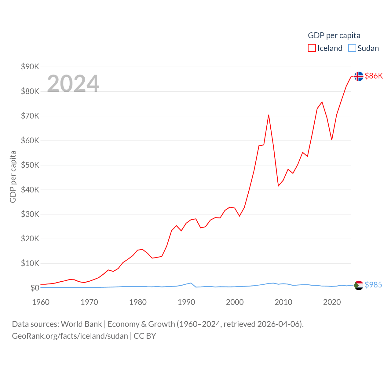 By GDP, Iceland ranks 108/197 ($33.3B) and Sudan ranks 94/197 ($49.7B). By GDP per capita, Iceland ranks 9/197 ($86,041), while Sudan ranks 179/197 ($985).