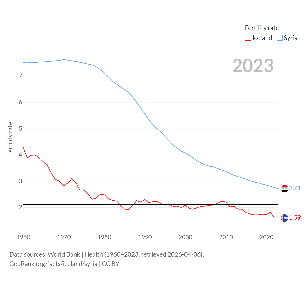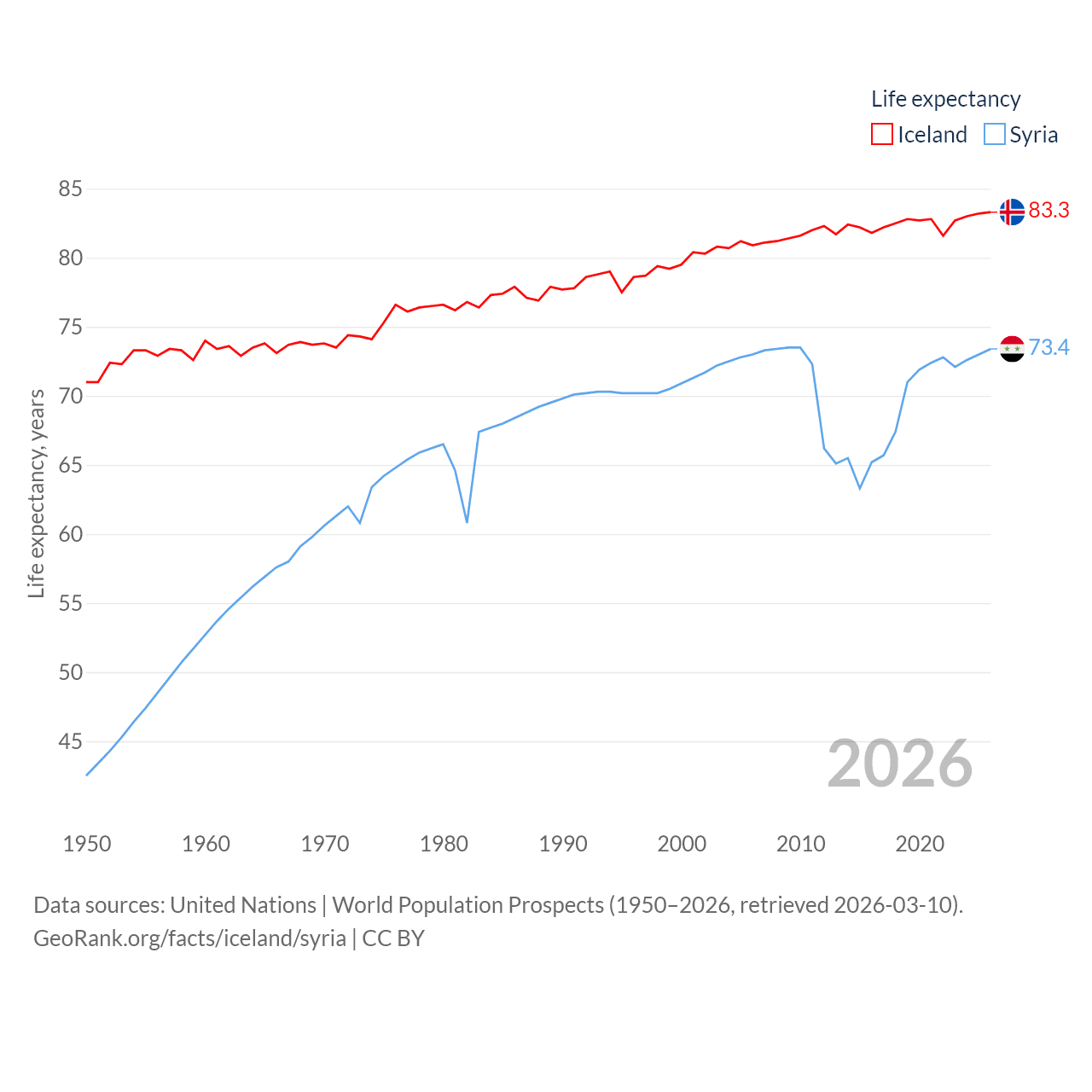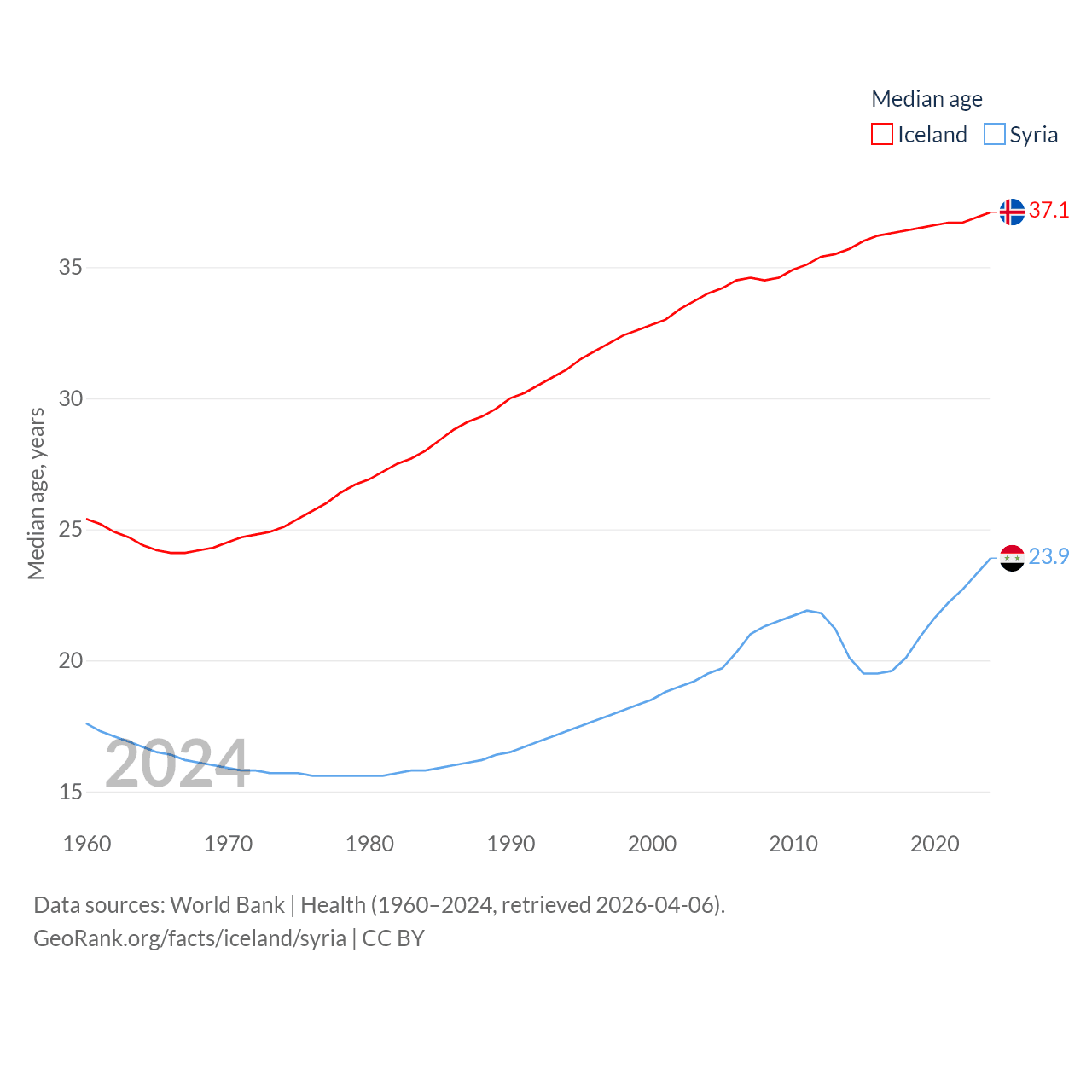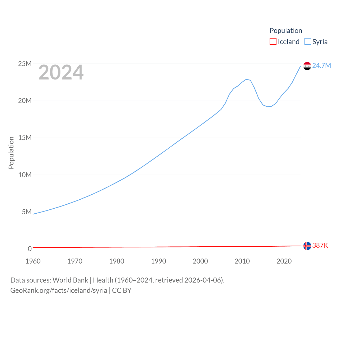 Iceland has a population of 387K (ranked 173/197), compared with 24.7M in Syria (ranked 57/197). Iceland's land area is 38,931 sq mi versus 70,900 sq mi for Syria (ranked 104th vs. 87th).
