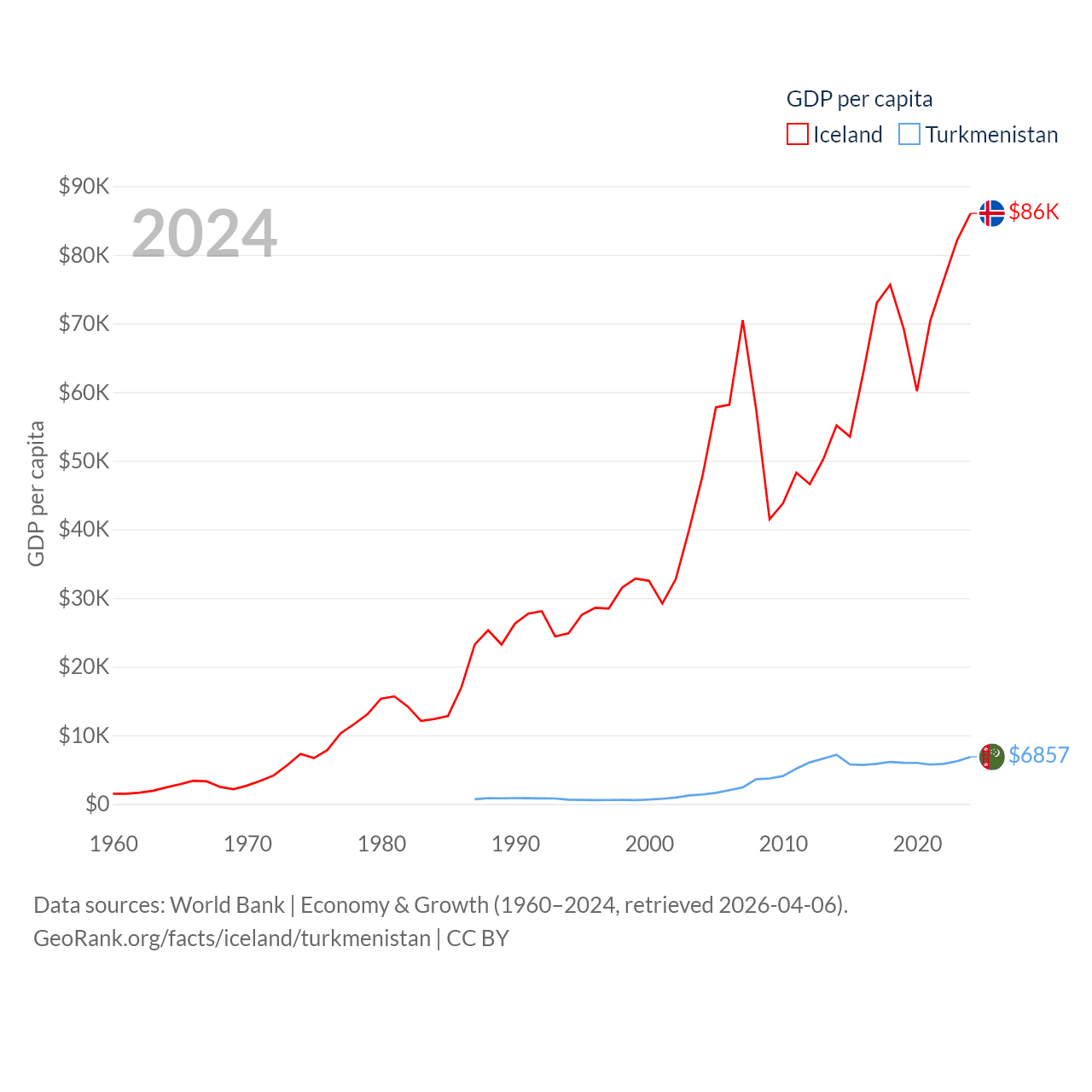 By GDP, Iceland ranks 108/197 ($33.3B) and Turkmenistan ranks 92/197 ($51.4B). By GDP per capita, Iceland ranks 9/197 ($86,041), while Turkmenistan ranks 104/197 ($6,857).