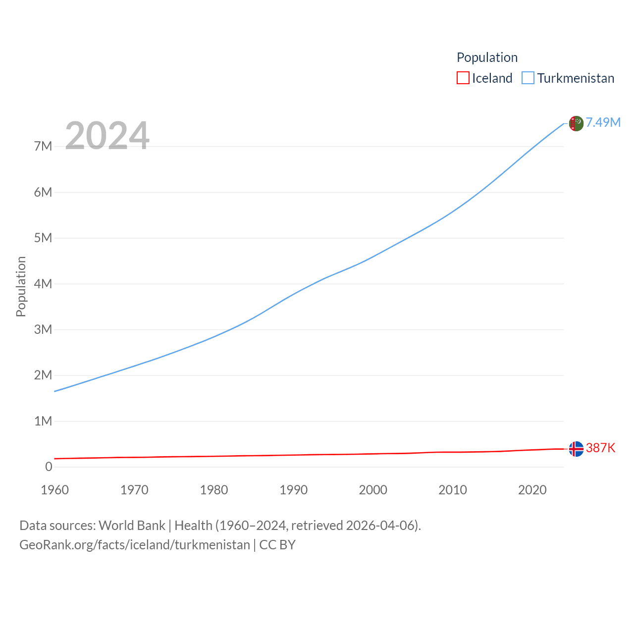 Iceland has a population of 387K (ranked 173/197), compared with 7.49M in Turkmenistan (ranked 104/197). Iceland's land area is 38,931 sq mi versus 181,441 sq mi for Turkmenistan (ranked 104th vs. 53rd).