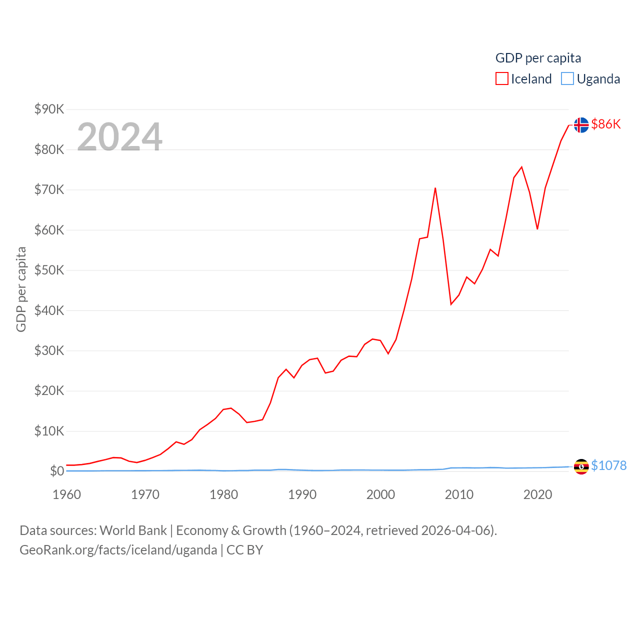 By GDP, Iceland ranks 108/197 ($33.3B) and Uganda ranks 89/197 ($53.9B). By GDP per capita, Iceland ranks 9/197 ($86,041), while Uganda ranks 176/197 ($1,078).