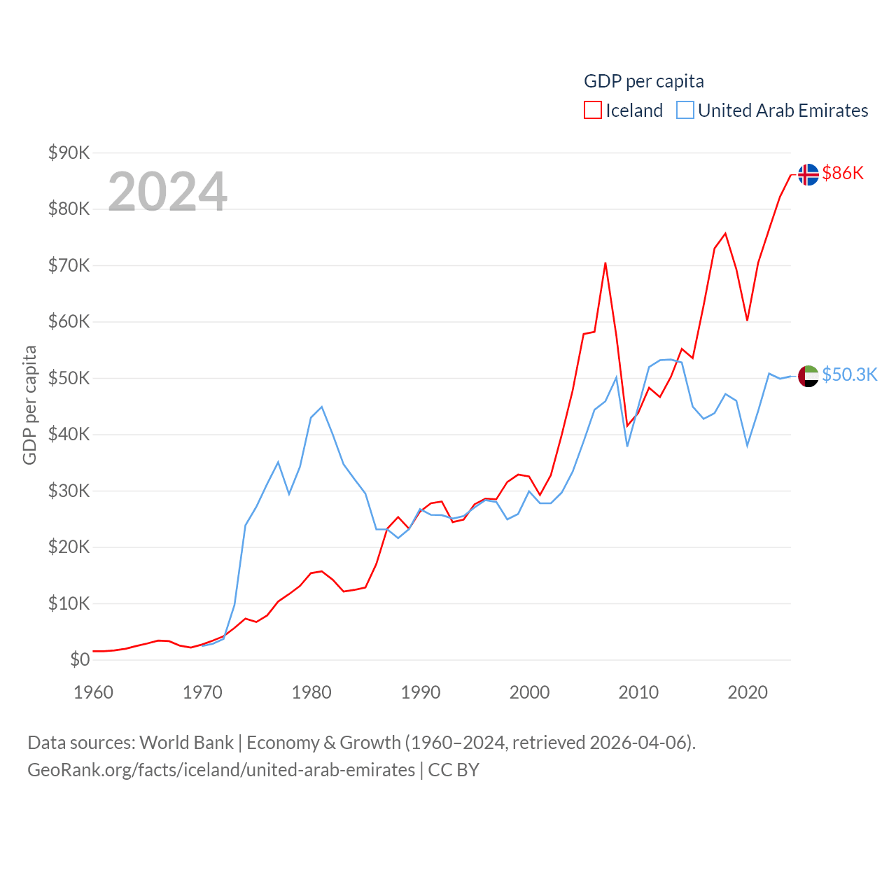 By GDP, Iceland ranks 108/197 ($33.3B) and The United Arab Emirates ranks 27/197 ($552B). By GDP per capita, Iceland ranks 9/197 ($86,041), while The United Arab Emirates ranks 24/197 ($50,274).