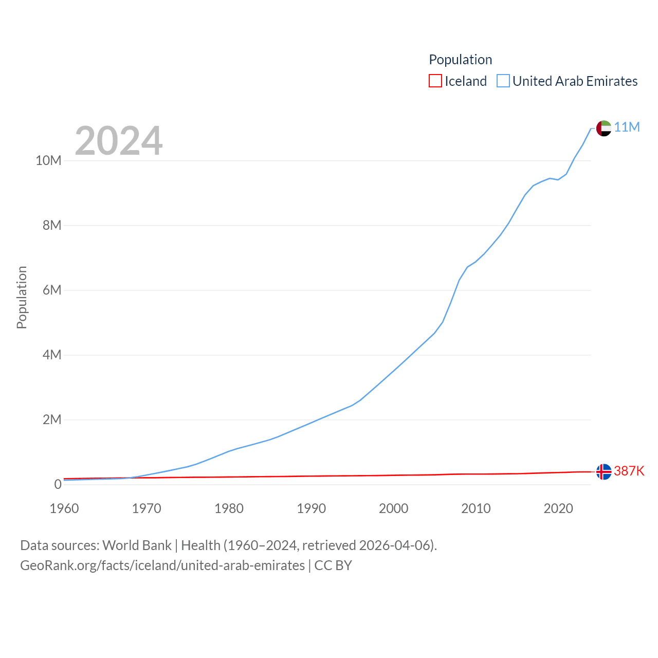 Iceland has a population of 387K (ranked 173/197), compared with 11M in The United Arab Emirates (ranked 86/197). Iceland's land area is 38,931 sq mi versus 27,421 sq mi for The United Arab Emirates (ranked 104th vs. 117th).
