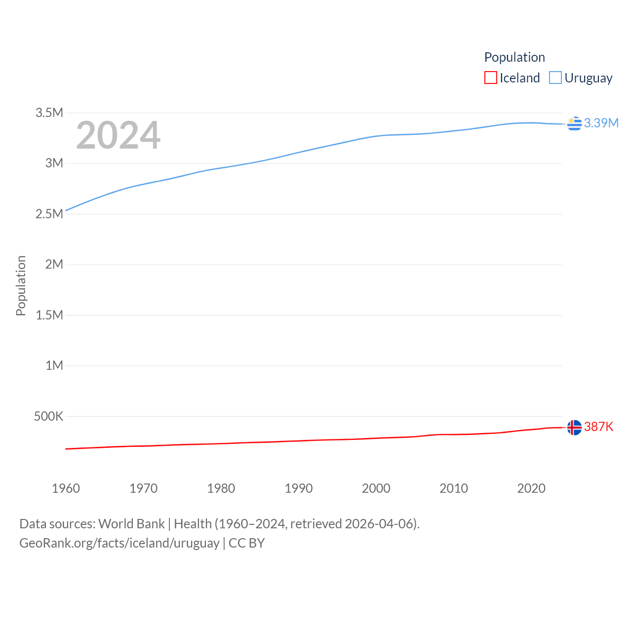 Iceland has a population of 387K (ranked 173/197), compared with 3.39M in Uruguay (ranked 133/197). Iceland's land area is 38,931 sq mi versus 67,576 sq mi for Uruguay (ranked 104th vs. 89th).