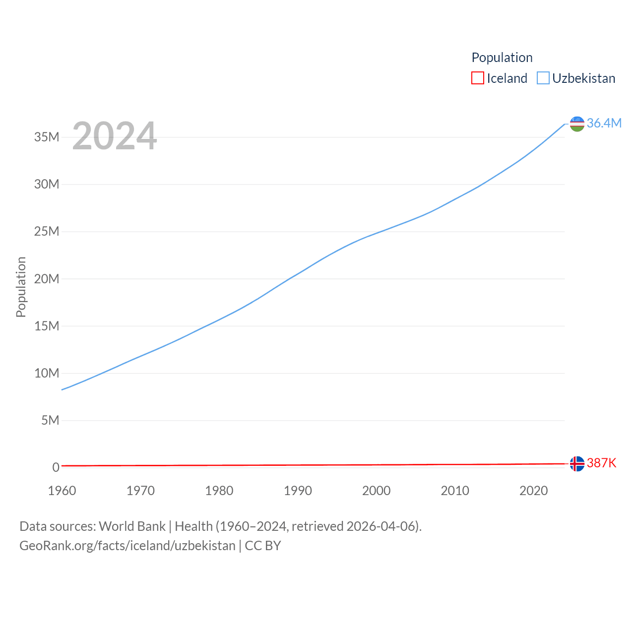 Iceland has a population of 387K (ranked 173/197), compared with 36.4M in Uzbekistan (ranked 43/197). Iceland's land area is 38,931 sq mi versus 170,136 sq mi for Uzbekistan (ranked 104th vs. 56th).