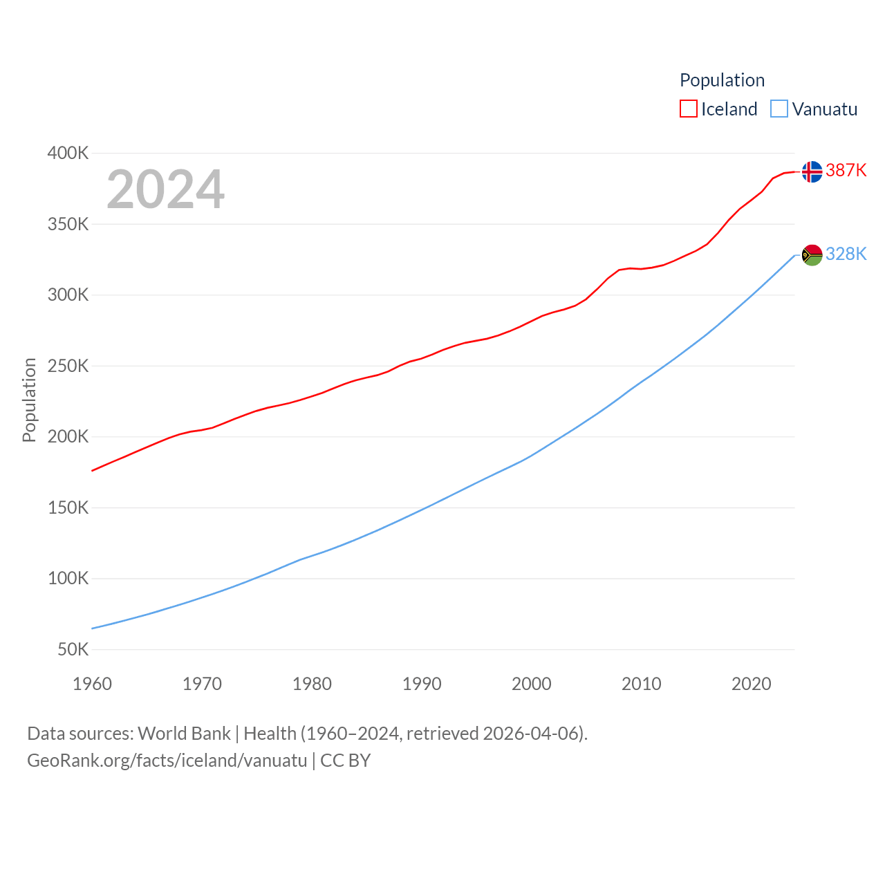 Iceland has a population of 387K (ranked 173/197), compared with 328K in Vanuatu (ranked 174/197). Iceland's land area is 38,931 sq mi versus 4,707 sq mi for Vanuatu (ranked 104th vs. 157th).