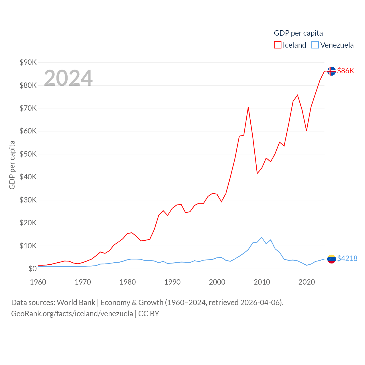 By GDP, Iceland ranks 108/197 ($33.3B) and Venezuela ranks 65/197 ($120B). By GDP per capita, Iceland ranks 9/197 ($86,041), while Venezuela ranks 128/197 ($4,218).