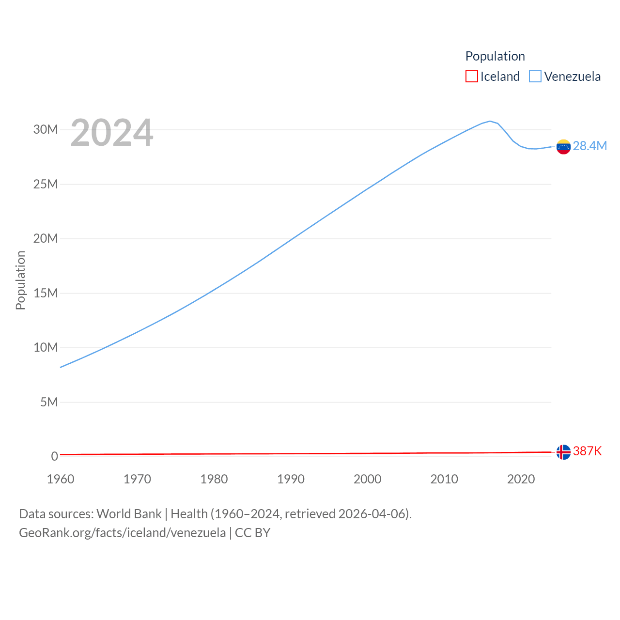 Iceland has a population of 387K (ranked 173/197), compared with 28.4M in Venezuela (ranked 53/197). Iceland's land area is 38,931 sq mi versus 340,561 sq mi for Venezuela (ranked 104th vs. 32nd).