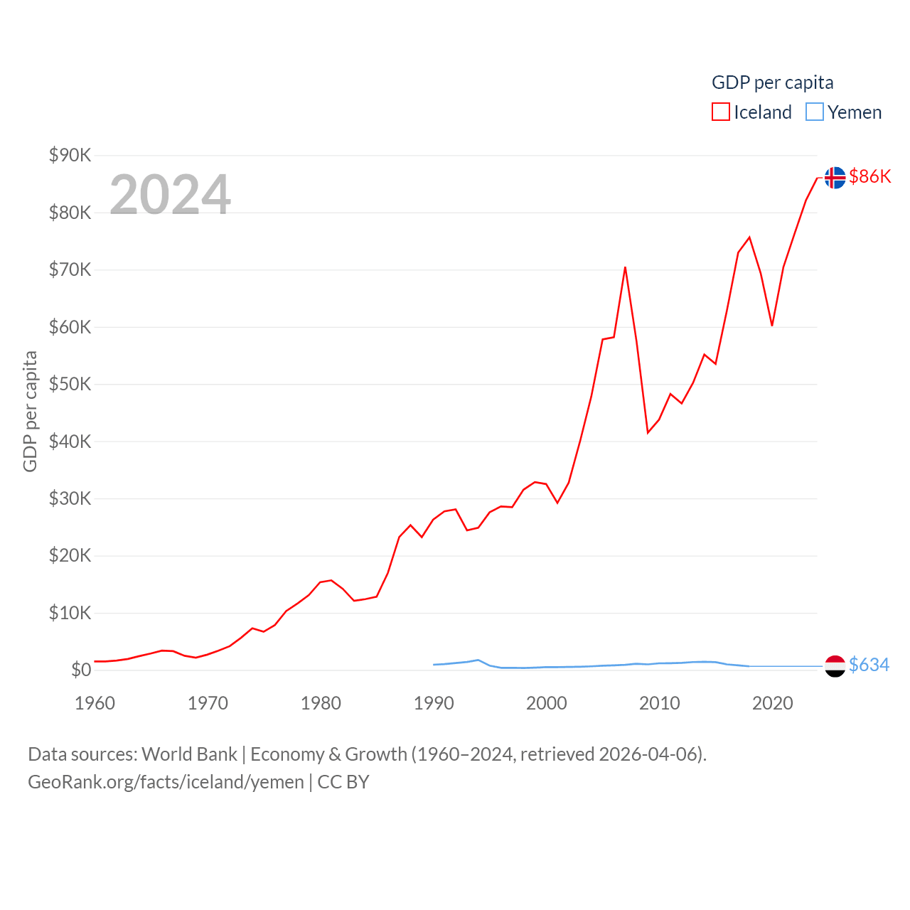 By GDP, Iceland ranks 108/197 ($33.3B) and Yemen ranks 125/197 ($21.6B). By GDP per capita, Iceland ranks 9/197 ($86,041), while Yemen ranks 191/197 ($634).