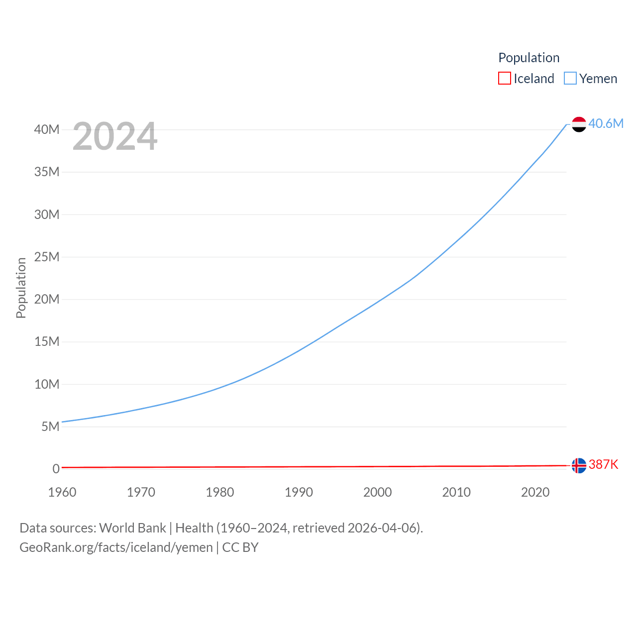Iceland has a population of 387K (ranked 173/197), compared with 40.6M in Yemen (ranked 38/197). Iceland's land area is 38,931 sq mi versus 203,850 sq mi for Yemen (ranked 104th vs. 49th).