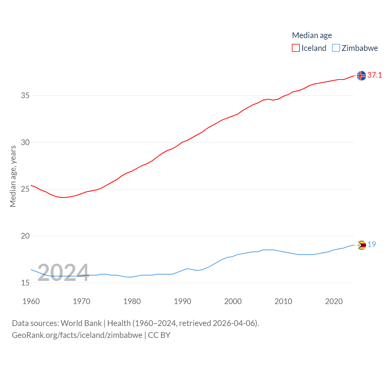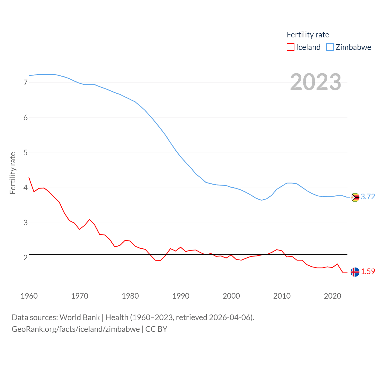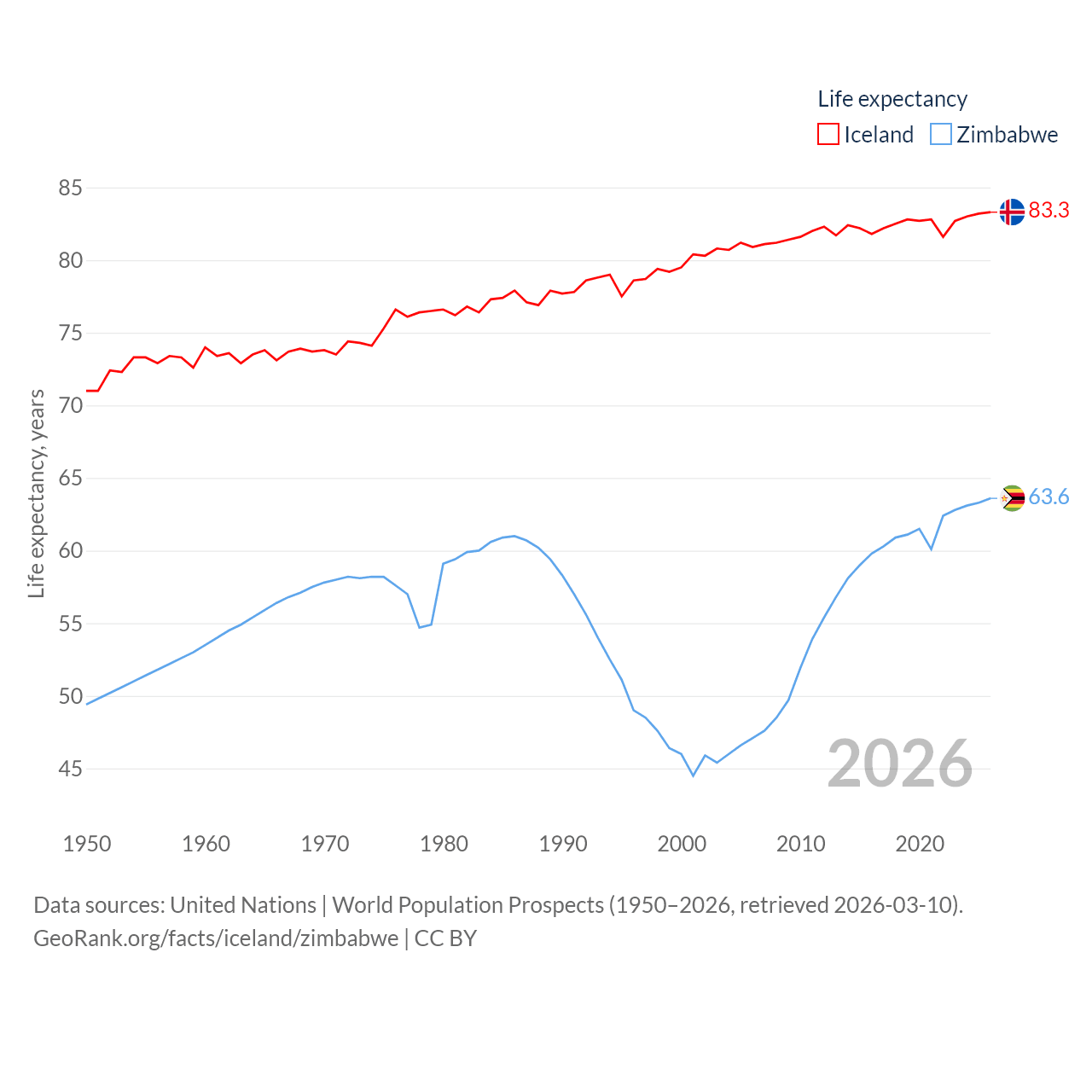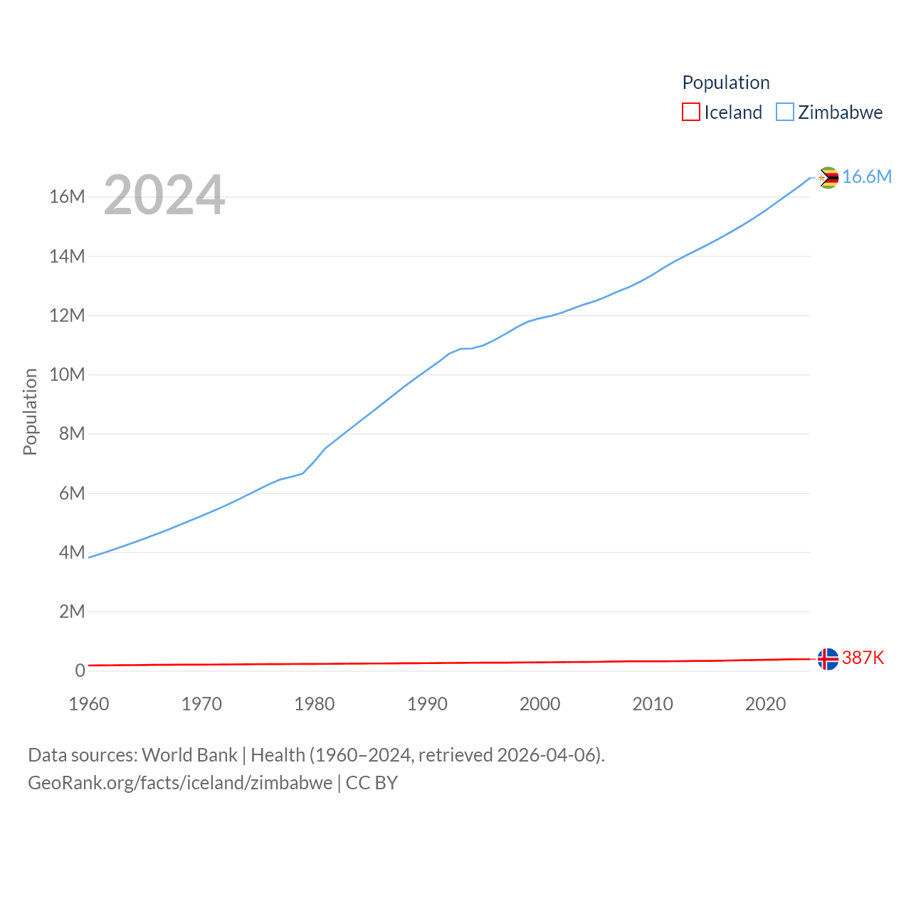 Iceland has a population of 387K (ranked 173/197), compared with 16.6M in Zimbabwe (ranked 74/197). Iceland's land area is 38,931 sq mi versus 149,364 sq mi for Zimbabwe (ranked 104th vs. 60th).