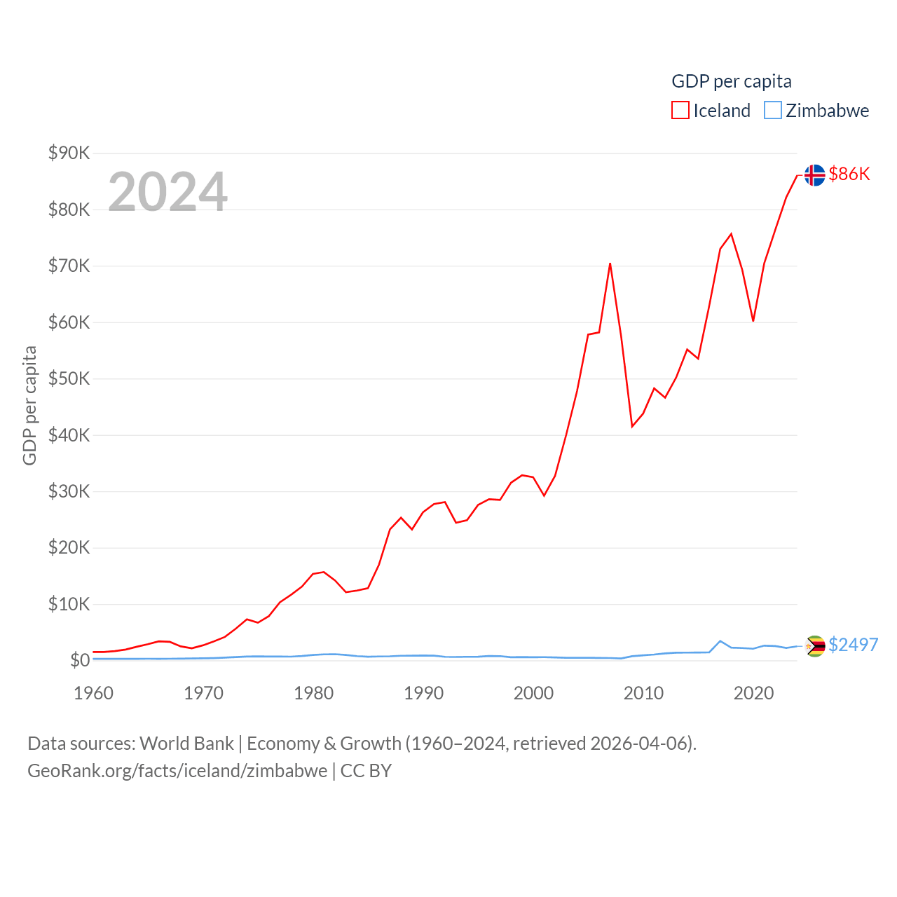 By GDP, Iceland ranks 108/197 ($33.3B) and Zimbabwe ranks 102/197 ($41.5B). By GDP per capita, Iceland ranks 9/197 ($86,041), while Zimbabwe ranks 148/197 ($2,497).