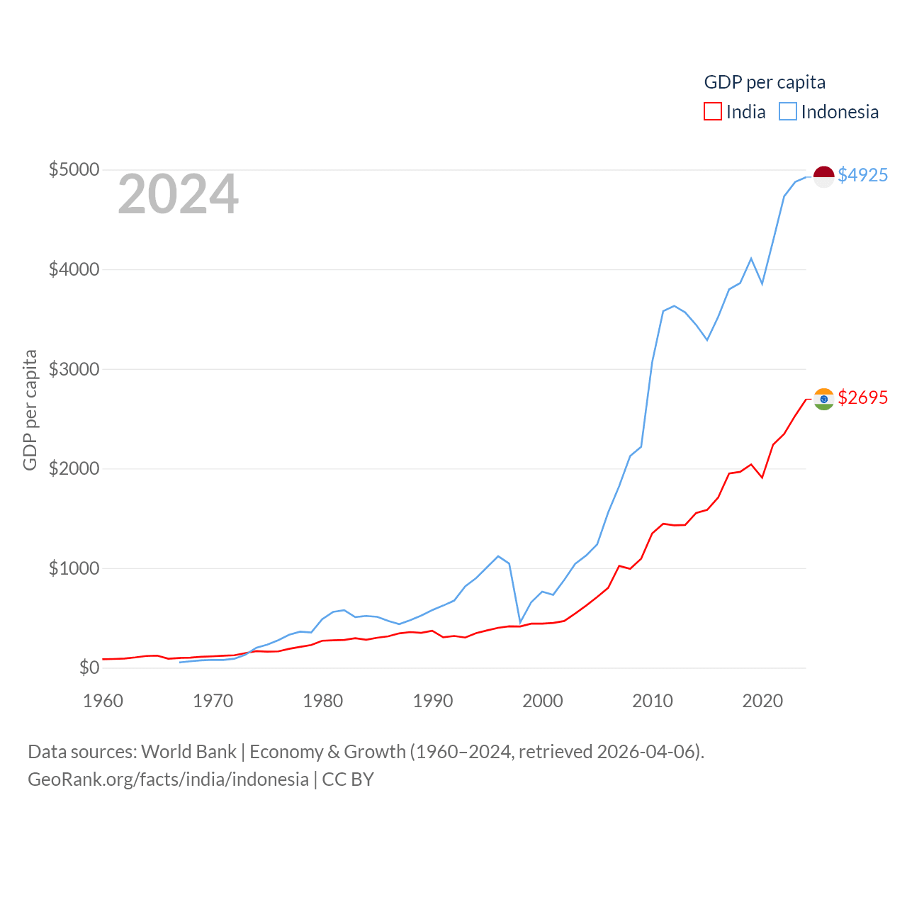 By GDP, India ranks 5/197 ($3.91T) and Indonesia ranks 16/197 ($1.4T). By GDP per capita, India ranks 143/197 ($2,695), while Indonesia ranks 121/197 ($4,925).