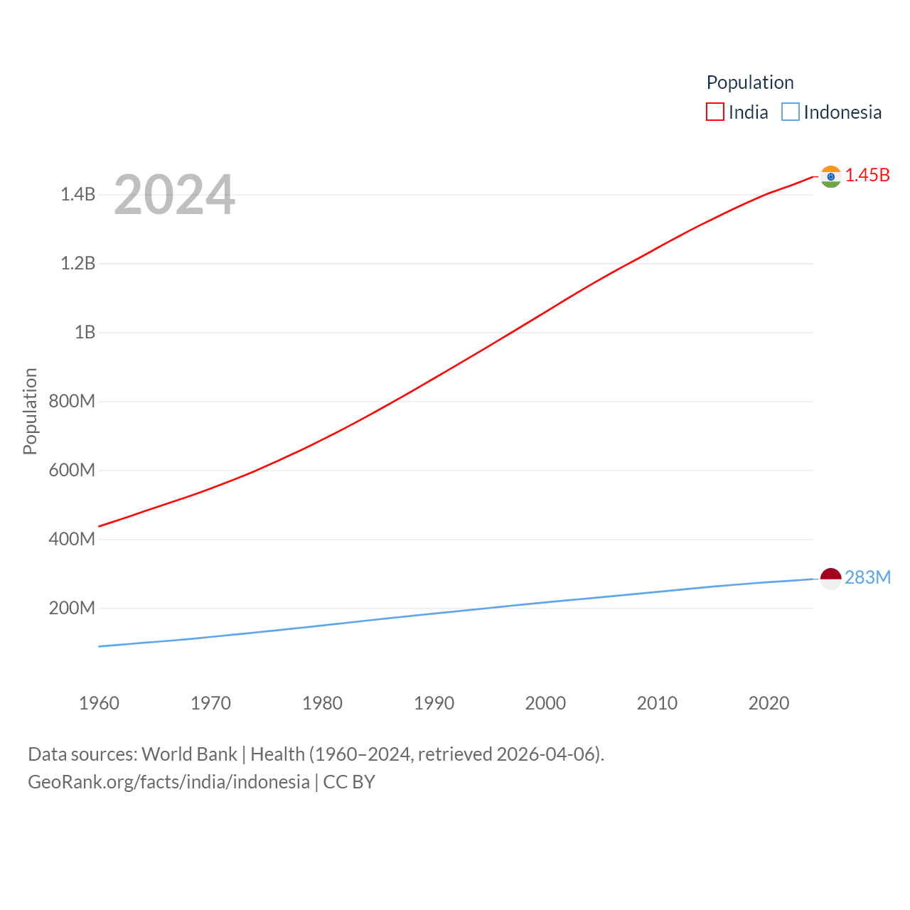 India has a population of 1.45B (ranked 1/197), compared with 283M in Indonesia (ranked 4/197). India's land area is 1,147,955 sq mi versus 730,720 sq mi for Indonesia (ranked 7th vs. 14th).