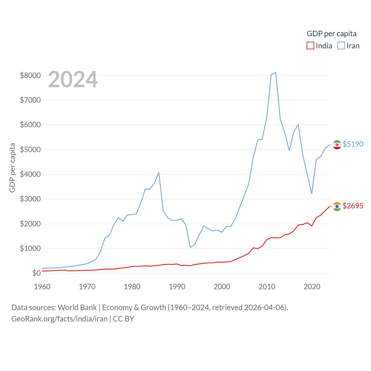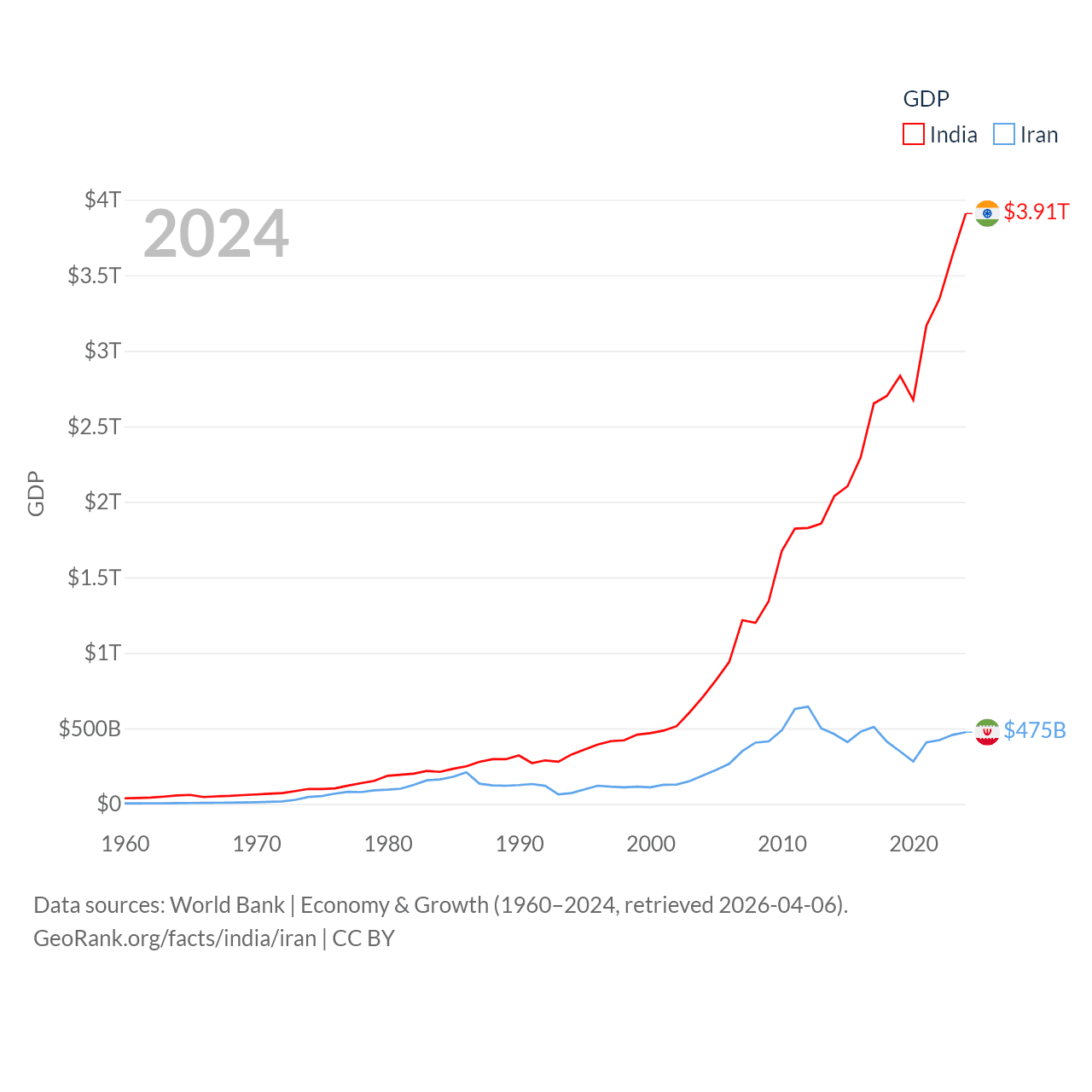 By GDP, India ranks 5/197 ($3.91T) and Iran ranks 34/197 ($475B). By GDP per capita, India ranks 143/197 ($2,695), while Iran ranks 119/197 ($5,190).