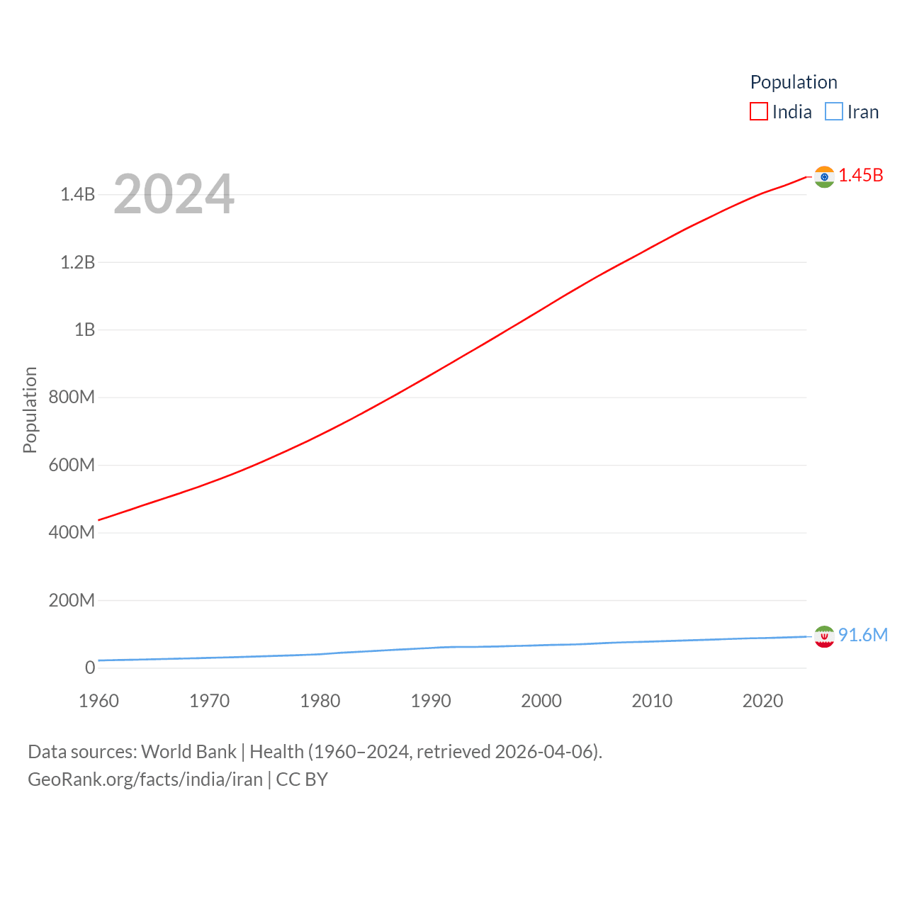 India has a population of 1.45B (ranked 1/197), compared with 91.6M in Iran (ranked 17/197). India's land area is 1,147,955 sq mi versus 626,451 sq mi for Iran (ranked 7th vs. 17th).