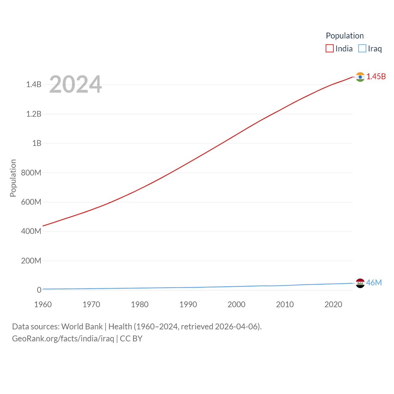 India has a population of 1.45B (ranked 1/197), compared with 46M in Iraq (ranked 34/197). India's land area is 1,147,955 sq mi versus 167,619 sq mi for Iraq (ranked 7th vs. 57th).