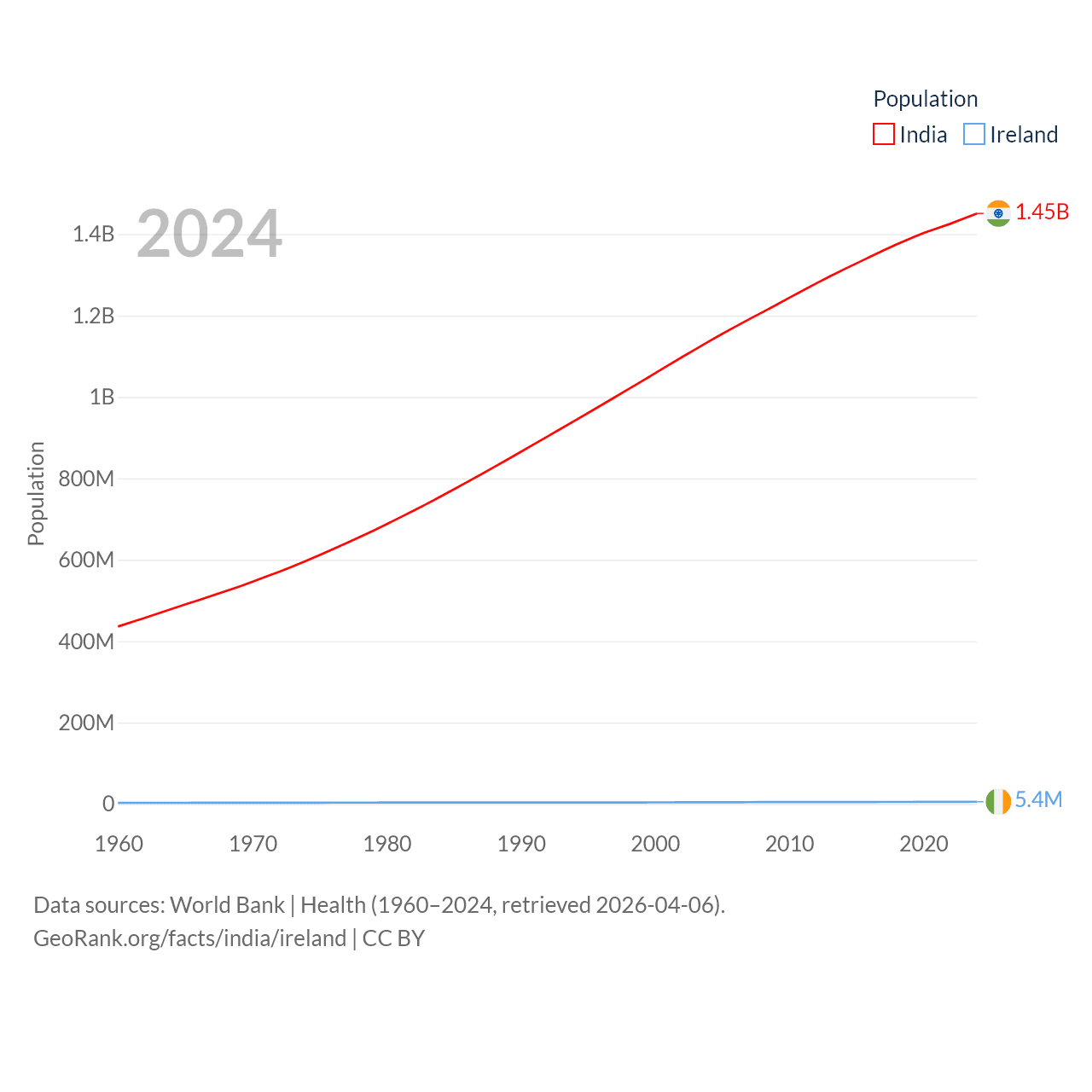 India has a population of 1.45B (ranked 1/197), compared with 5.4M in Ireland (ranked 120/197). India's land area is 1,147,955 sq mi versus 26,599 sq mi for Ireland (ranked 7th vs. 119th).
