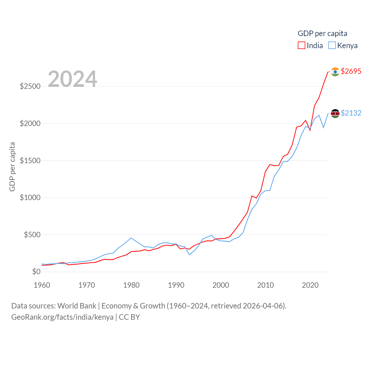 By GDP, India ranks 5/197 ($3.91T) and Kenya ranks 64/197 ($120B). By GDP per capita, India ranks 143/197 ($2,695), while Kenya ranks 154/197 ($2,132).