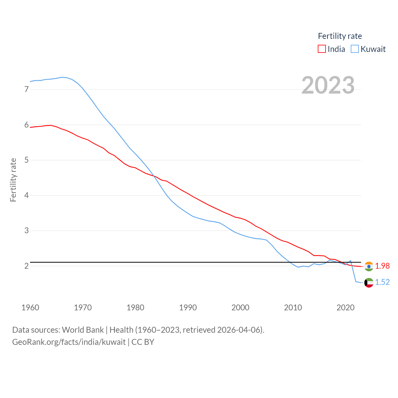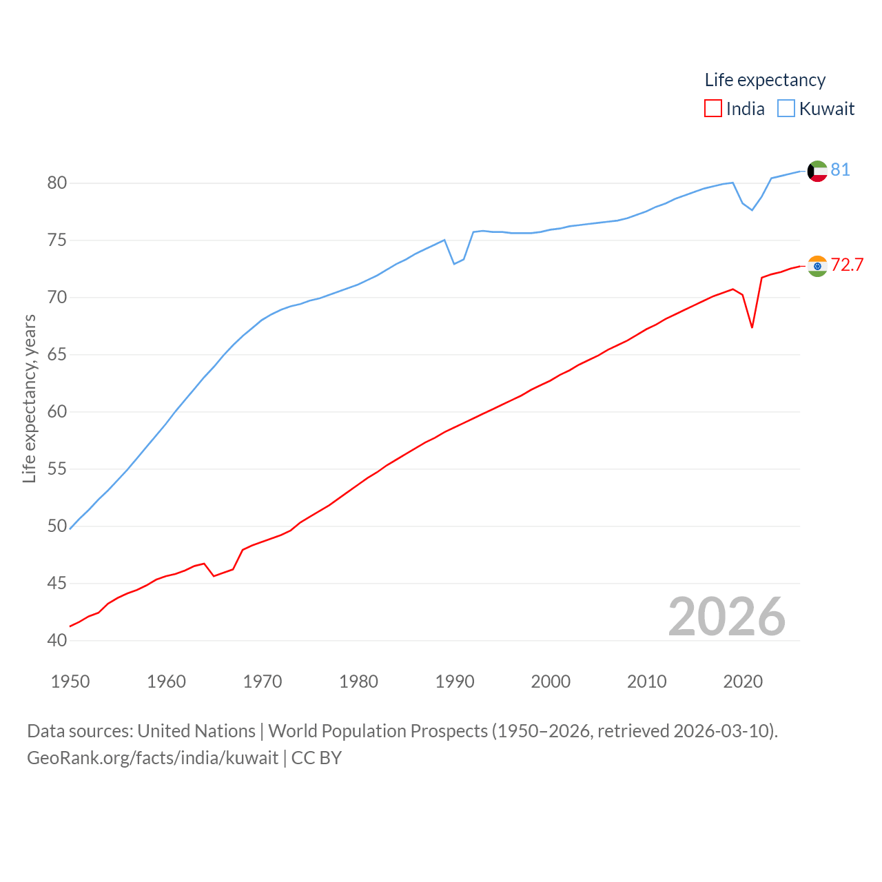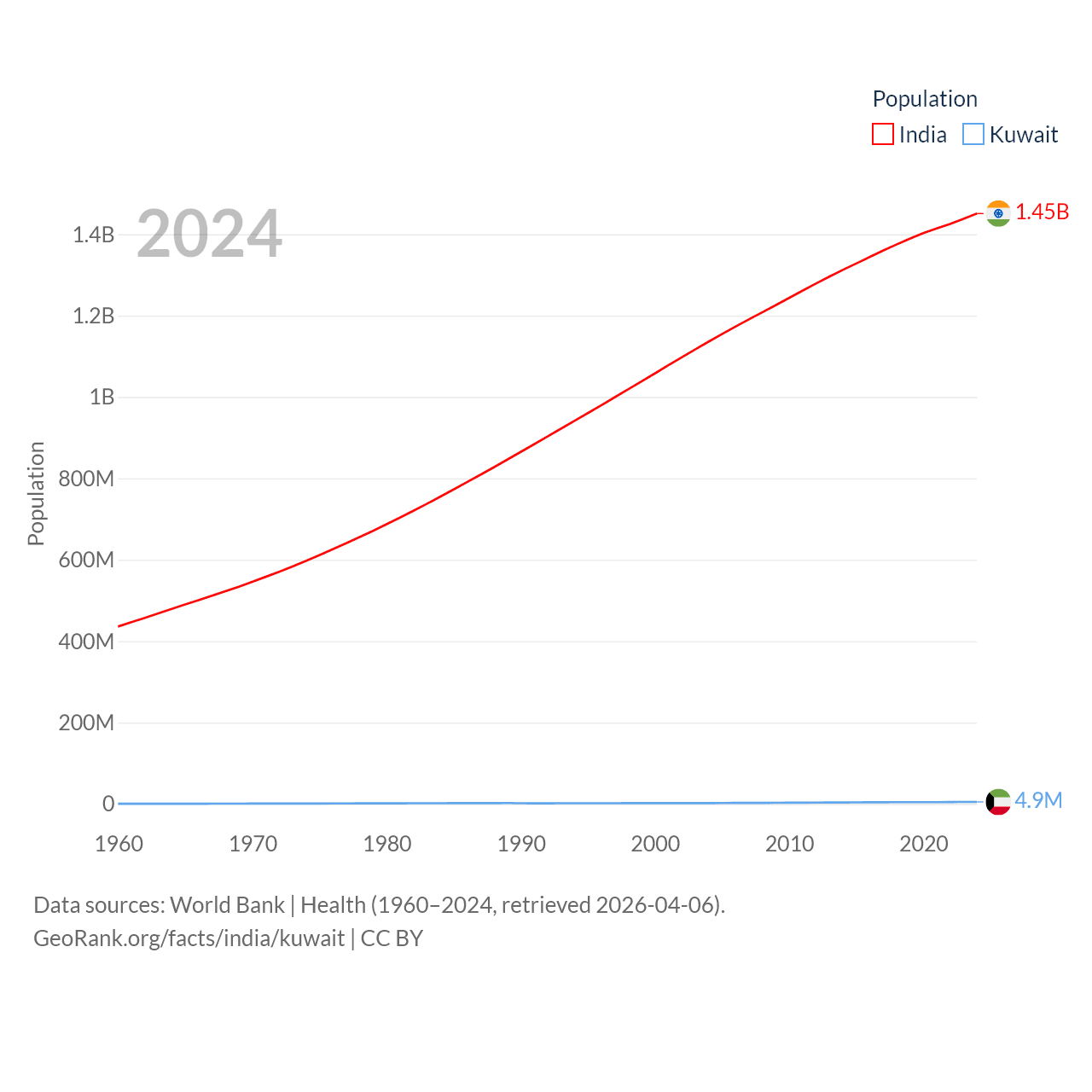 India has a population of 1.45B (ranked 1/197), compared with 4.9M in Kuwait (ranked 127/197). India's land area is 1,147,955 sq mi versus 6,880 sq mi for Kuwait (ranked 7th vs. 153rd).