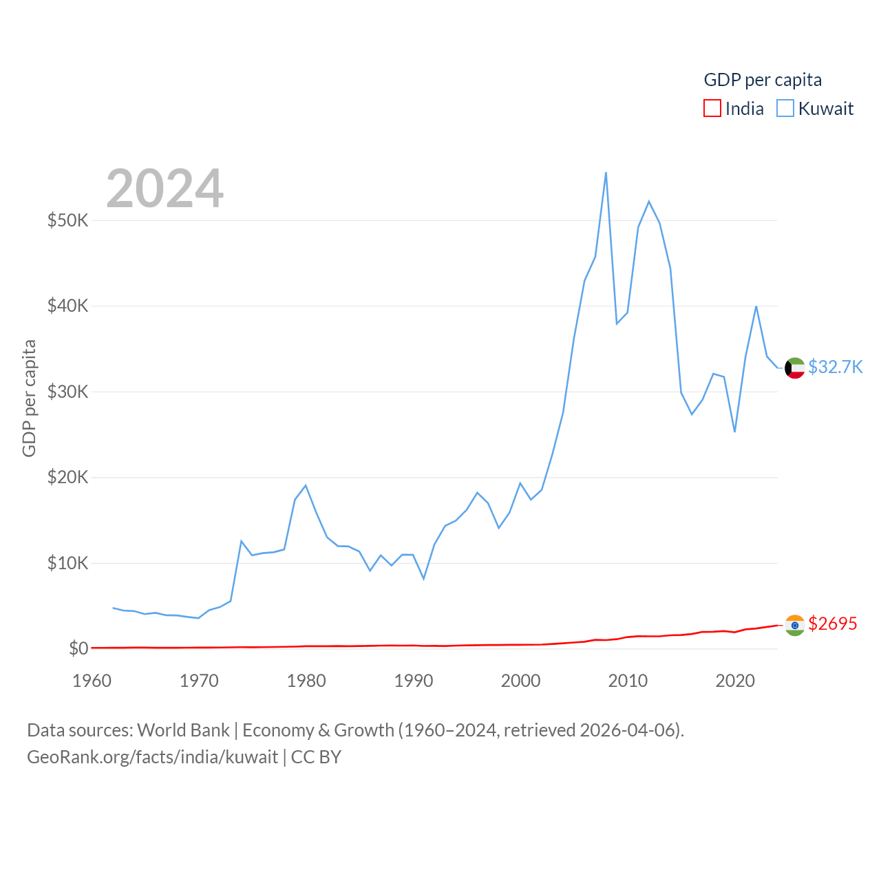 By GDP, India ranks 5/197 ($3.91T) and Kuwait ranks 59/197 ($160B). By GDP per capita, India ranks 143/197 ($2,695), while Kuwait ranks 37/197 ($32,718).