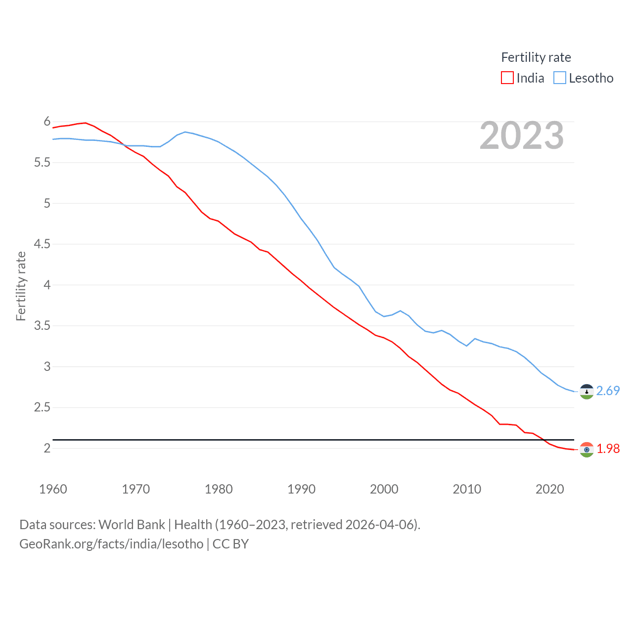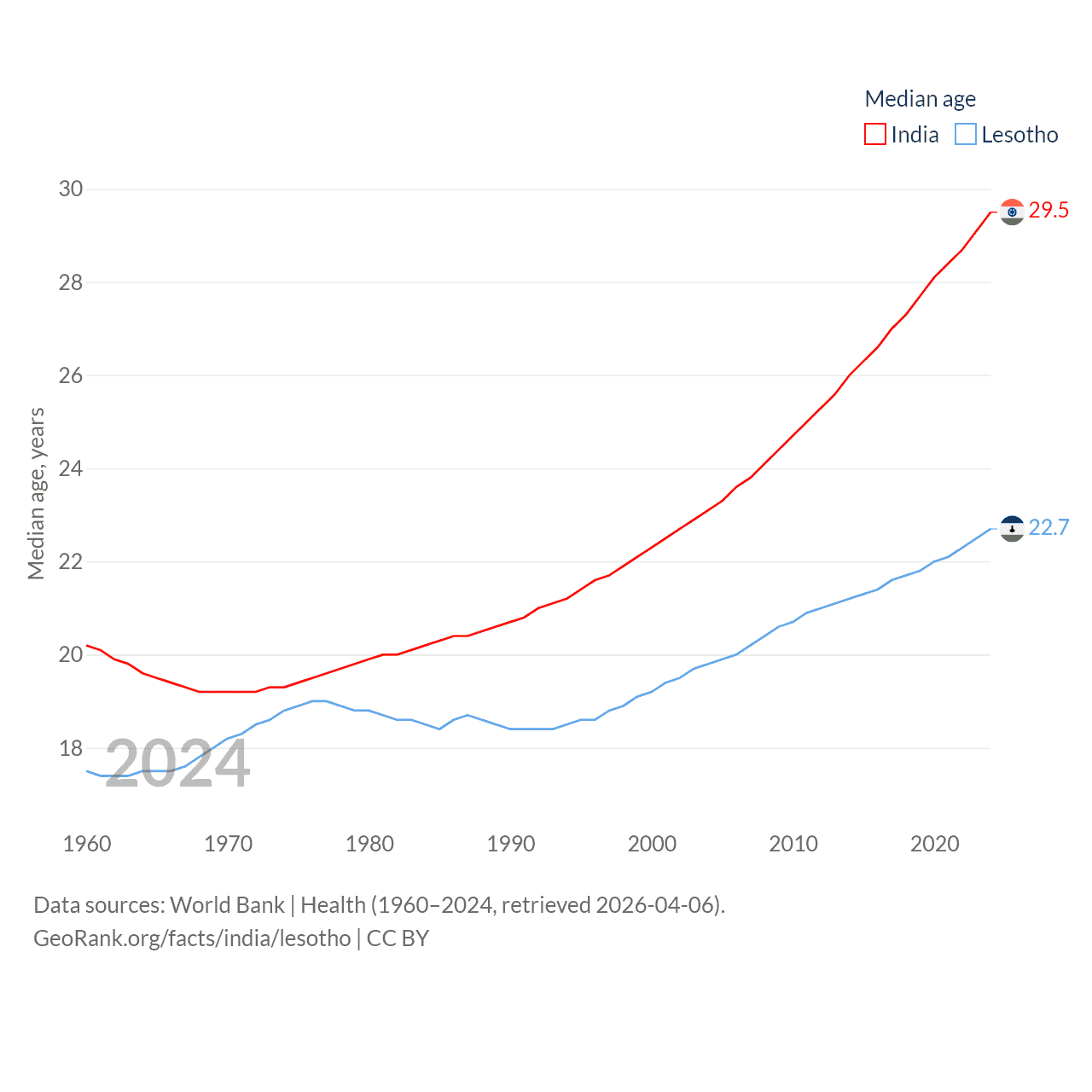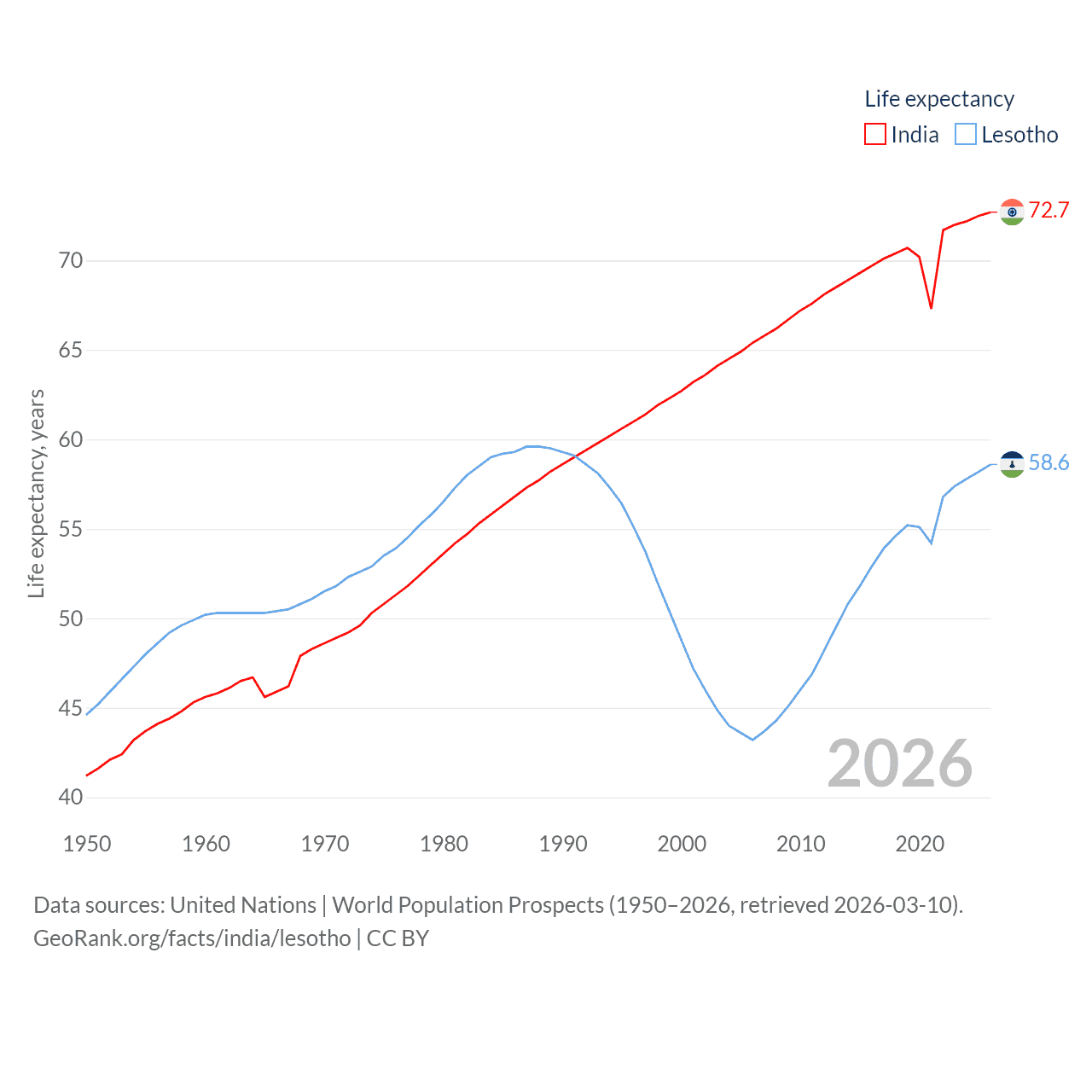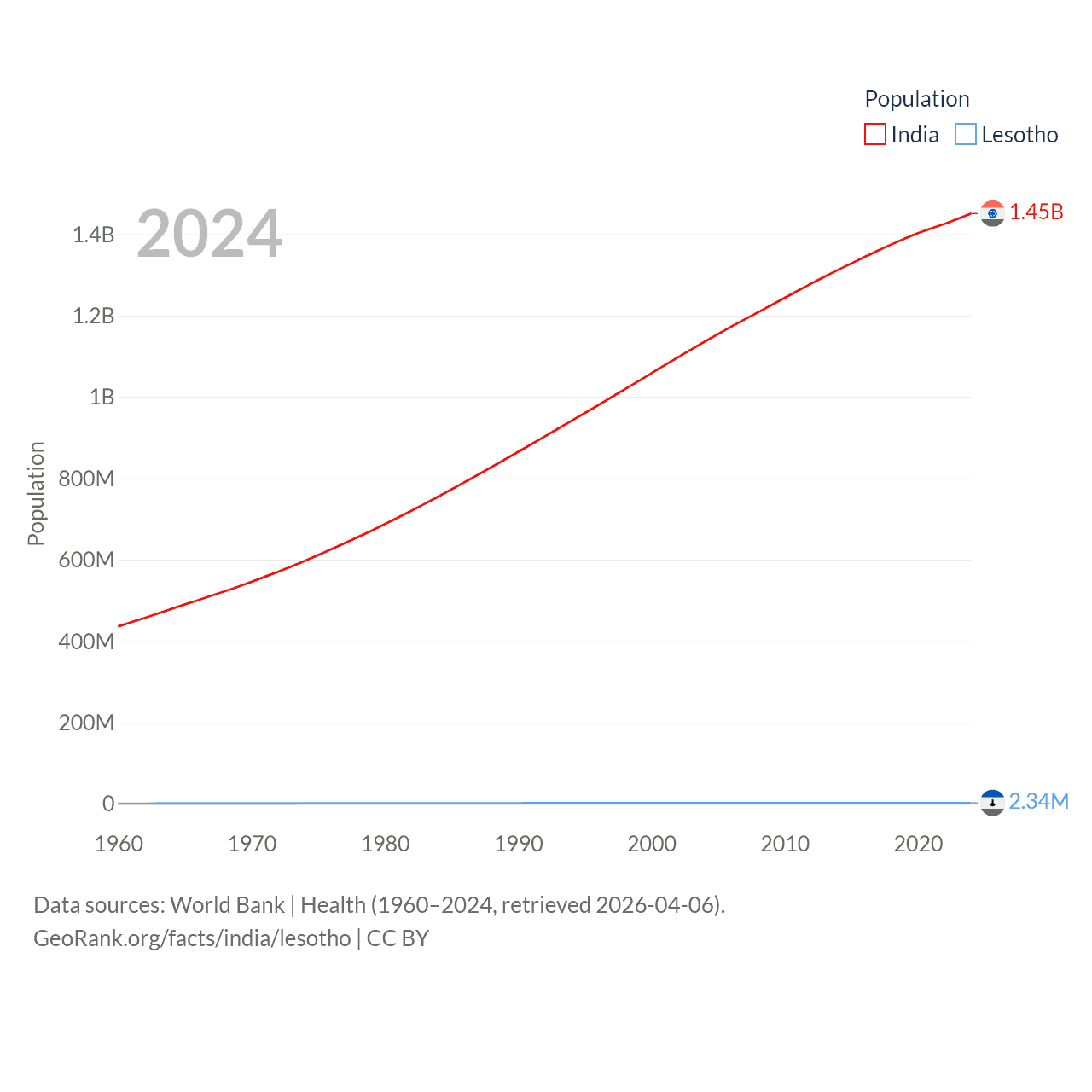 India has a population of 1.45B (ranked 1/197), compared with 2.34M in Lesotho (ranked 145/197). India's land area is 1,147,955 sq mi versus 11,722 sq mi for Lesotho (ranked 7th vs. 137th).