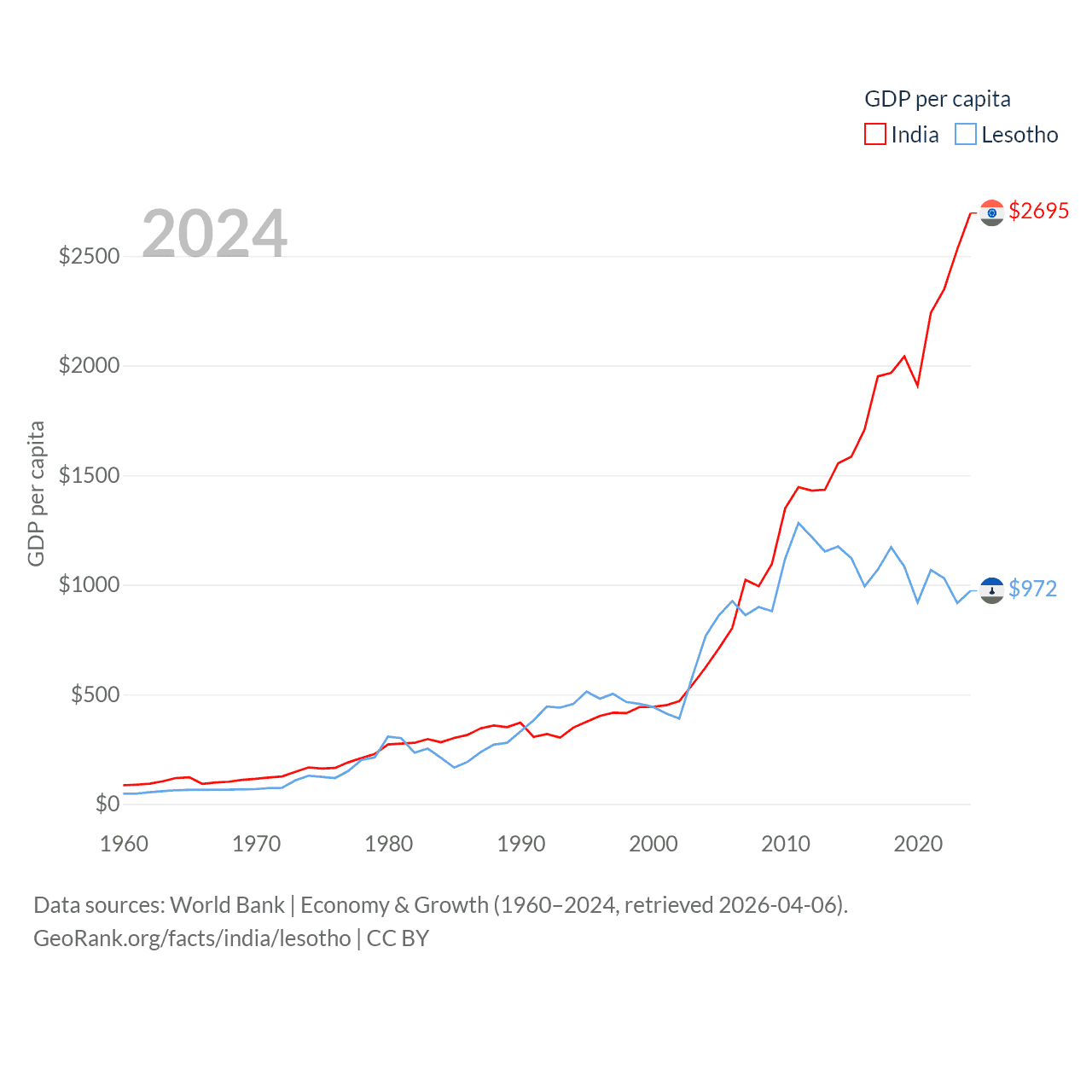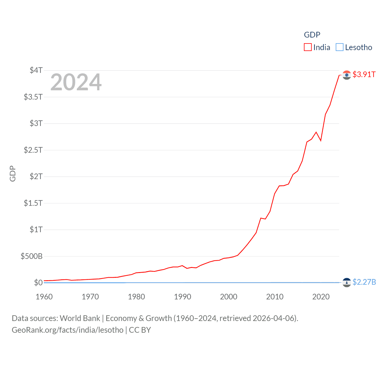 By GDP, India ranks 5/197 ($3.91T) and Lesotho ranks 175/197 ($2.27B). By GDP per capita, India ranks 143/197 ($2,695), while Lesotho ranks 181/197 ($972).