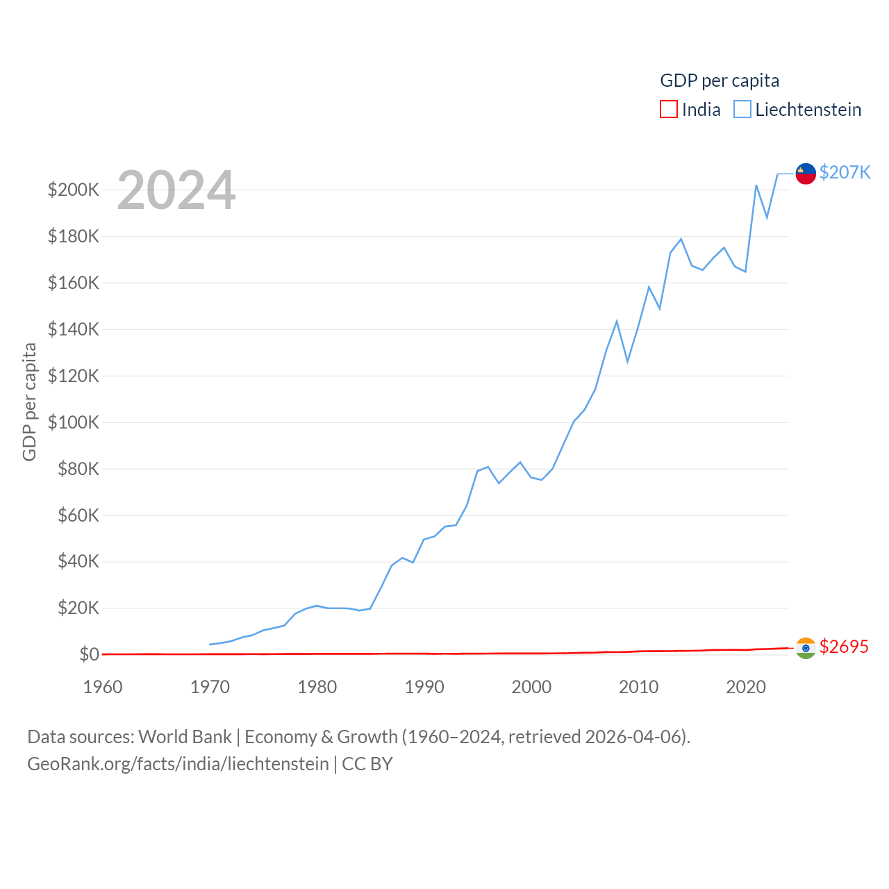 By GDP, India ranks 5/197 ($3.91T) and Liechtenstein ranks 156/197 ($8.24B). By GDP per capita, India ranks 143/197 ($2,695), while Liechtenstein ranks 2/197 ($206,781).