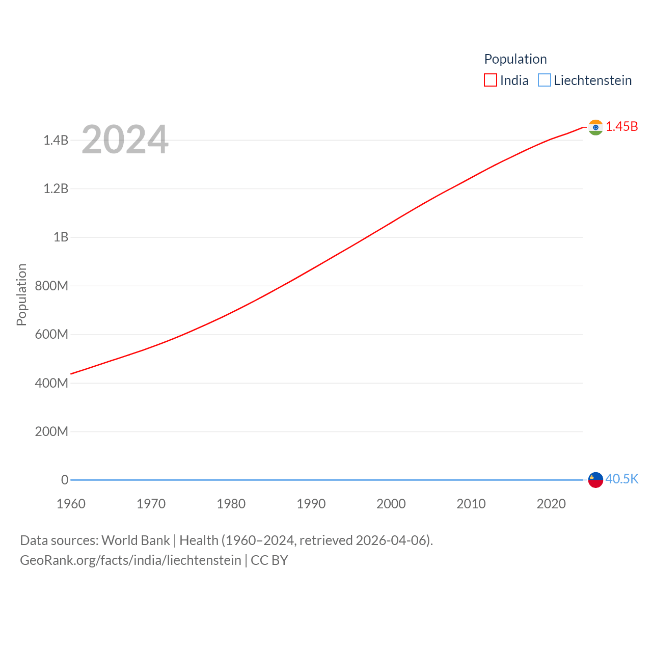 India has a population of 1.45B (ranked 1/197), compared with 40.4K in Liechtenstein (ranked 190/197). India's land area is 1,147,955 sq mi versus 61.8 sq mi for Liechtenstein (ranked 7th vs. 192nd).