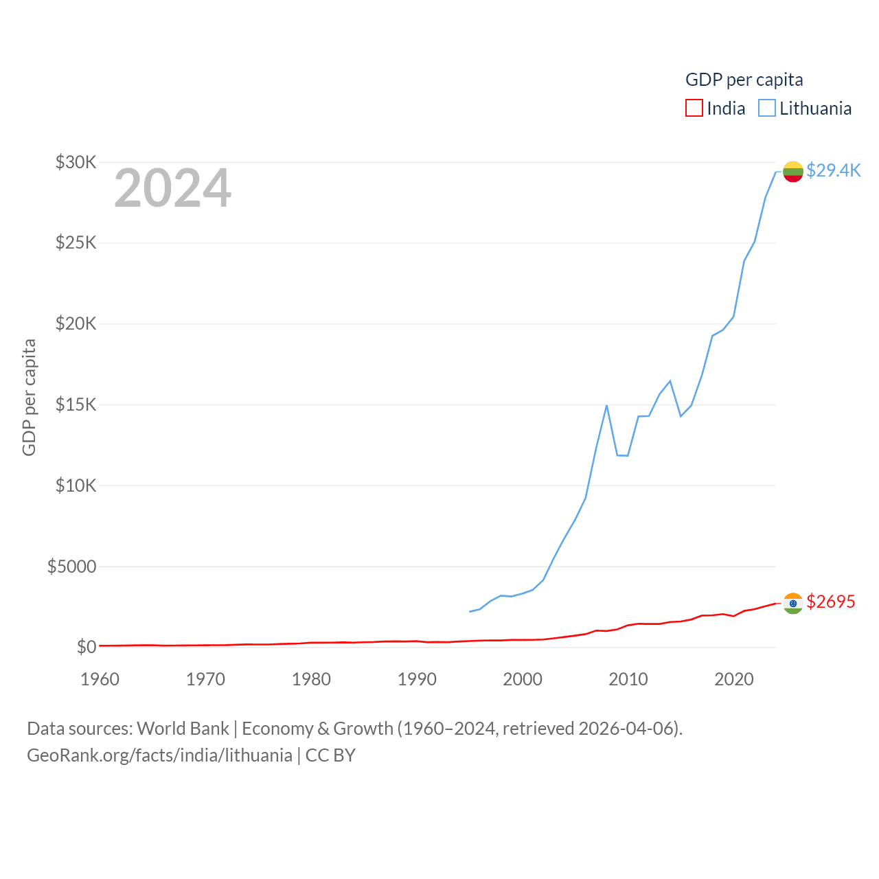 By GDP, India ranks 5/197 ($3.91T) and Lithuania ranks 79/197 ($84.9B). By GDP per capita, India ranks 143/197 ($2,695), while Lithuania ranks 43/197 ($29,384).