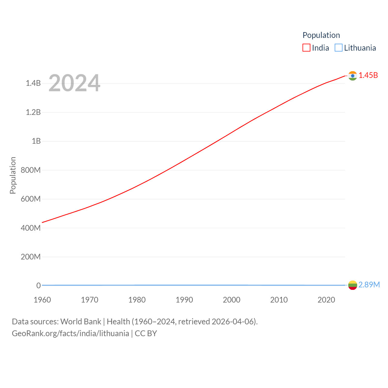 India has a population of 1.45B (ranked 1/197), compared with 2.89M in Lithuania (ranked 137/197). India's land area is 1,147,955 sq mi versus 24,170 sq mi for Lithuania (ranked 7th vs. 120th).