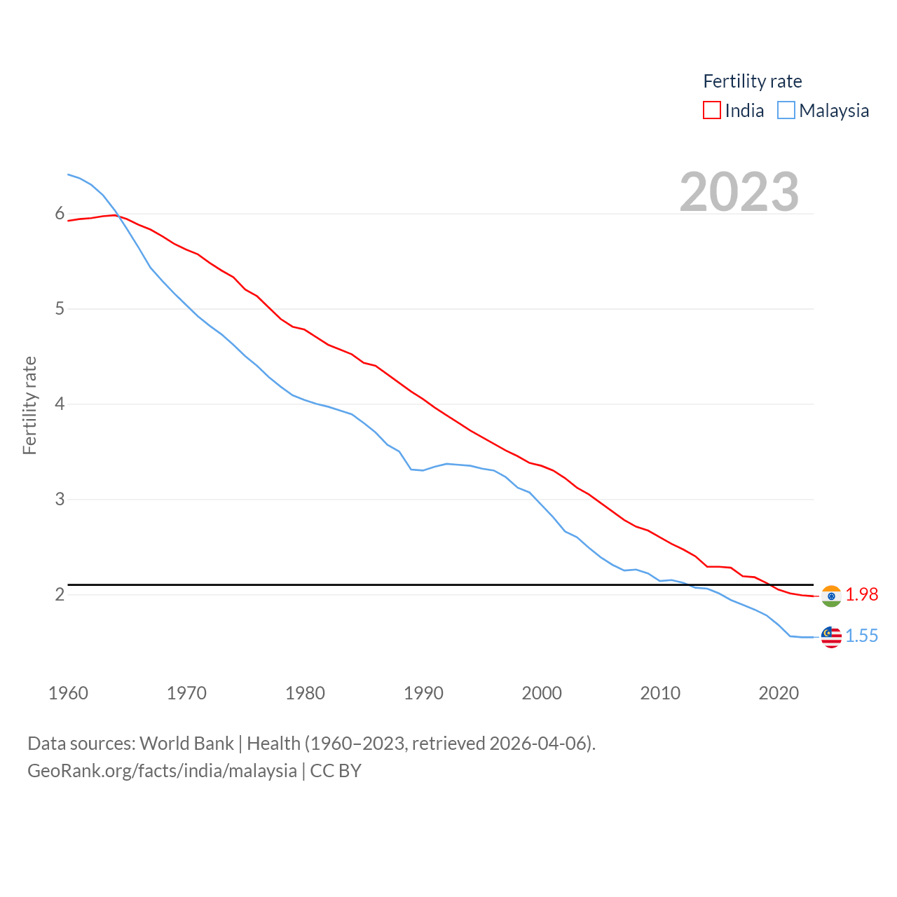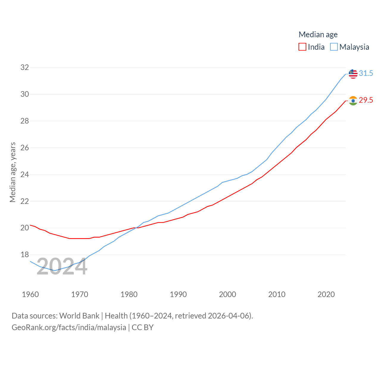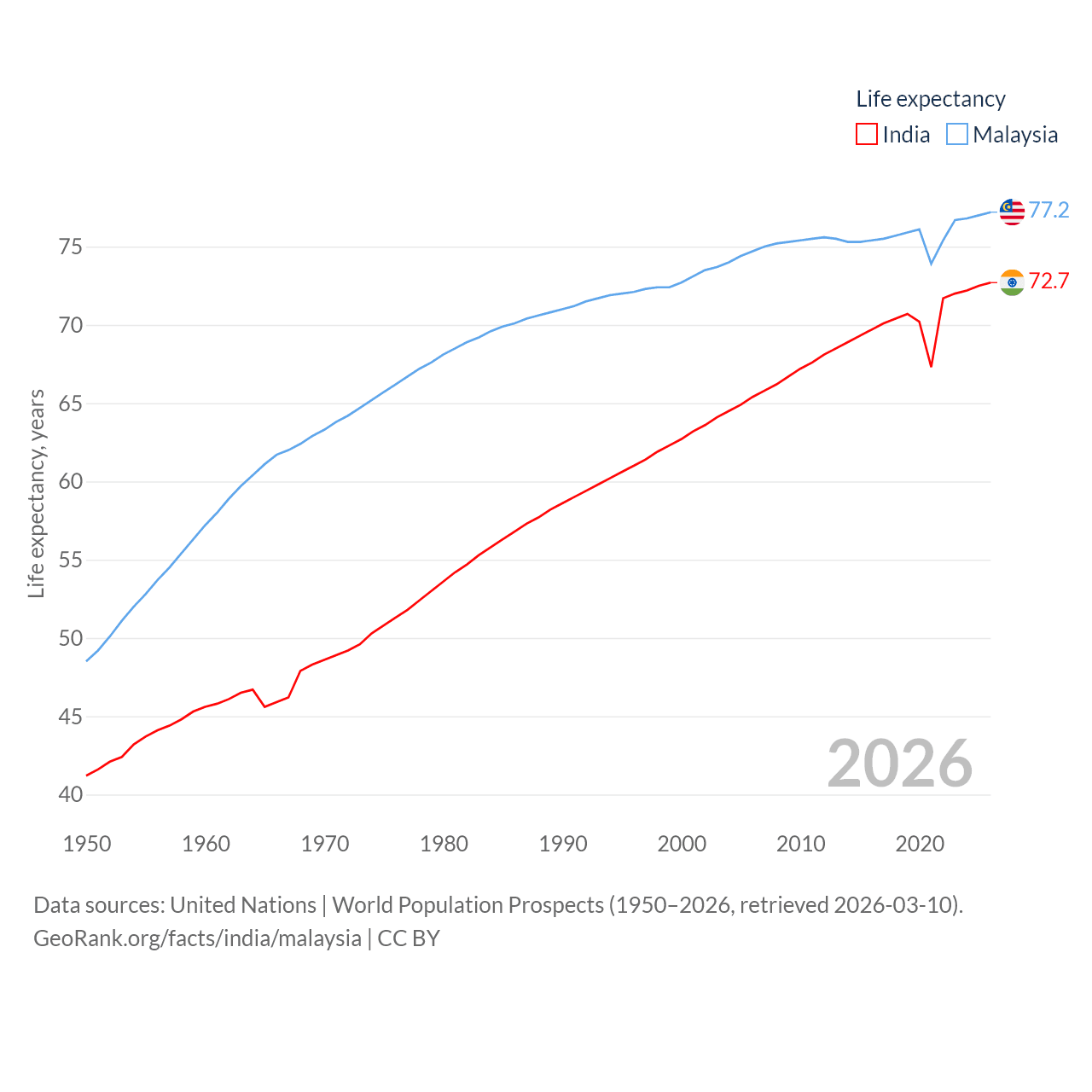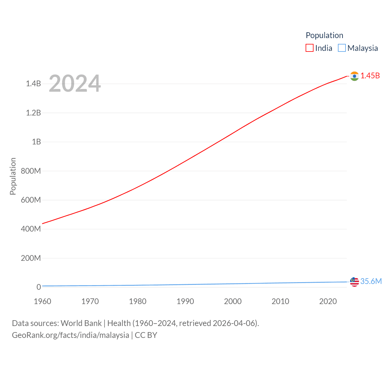 India has a population of 1.45B (ranked 1/197), compared with 35.6M in Malaysia (ranked 44/197). India's land area is 1,147,955 sq mi versus 126,854 sq mi for Malaysia (ranked 7th vs. 65th).