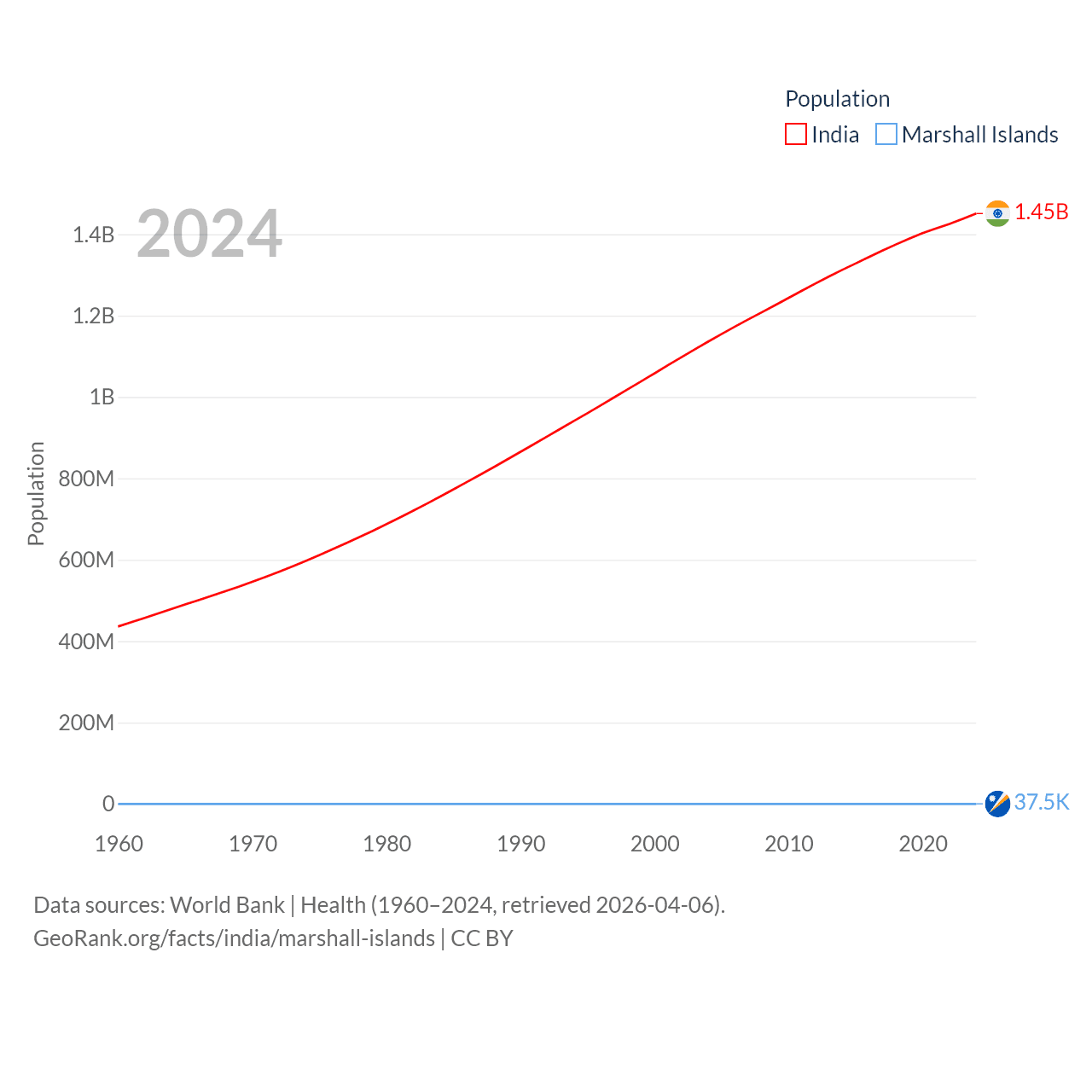 India has a population of 1.45B (ranked 1/197), compared with 37.5K in The Marshall Islands (ranked 192/197). India's land area is 1,147,955 sq mi versus 69.5 sq mi for The Marshall Islands (ranked 7th vs. 191st).