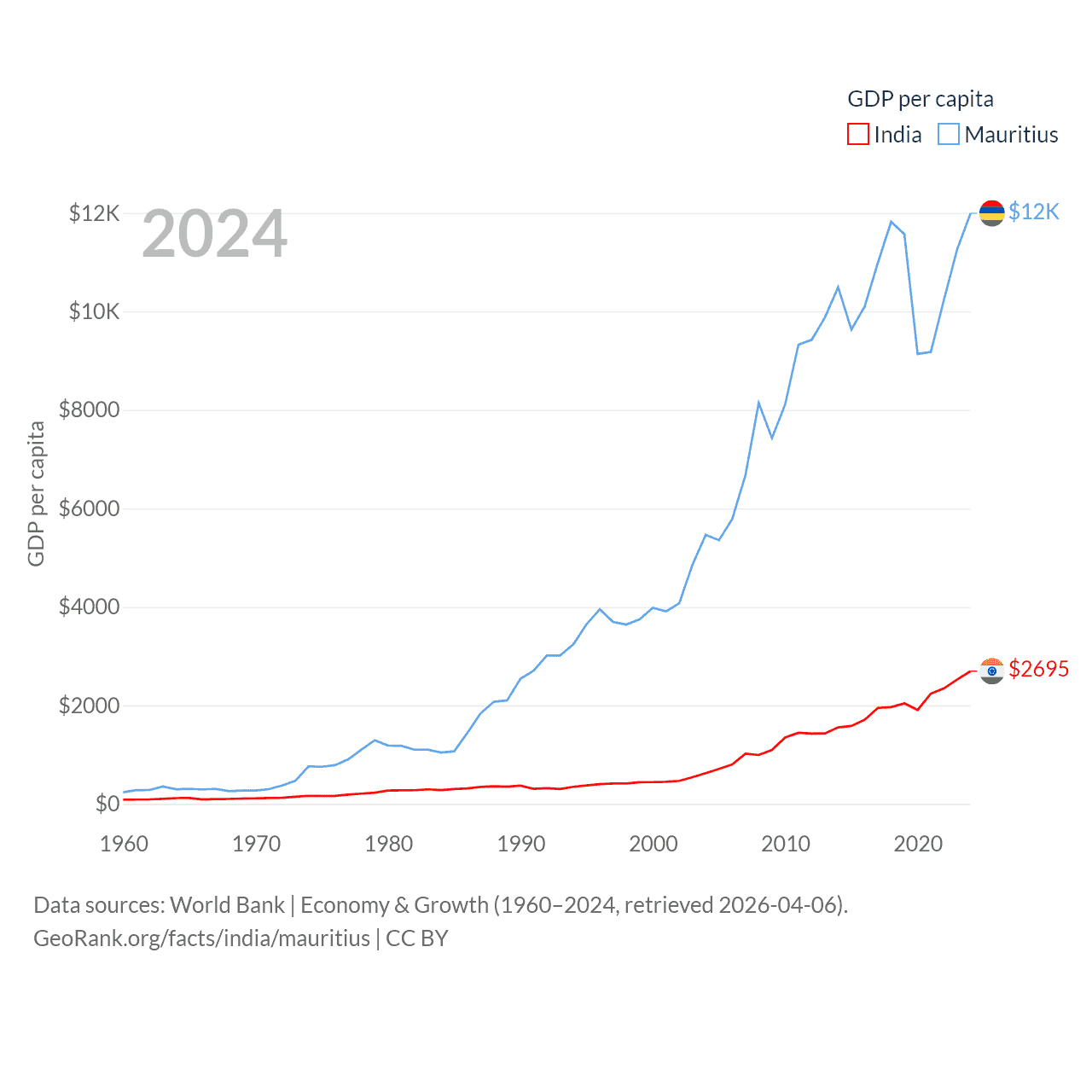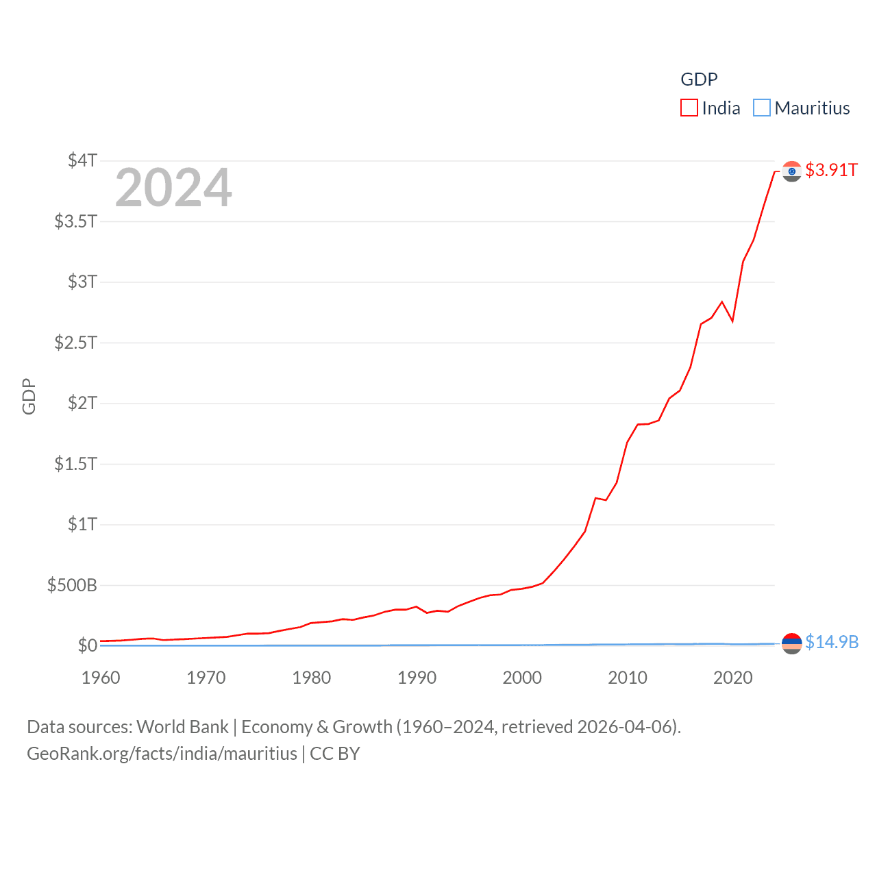 By GDP, India ranks 5/197 ($3.91T) and Mauritius ranks 143/197 ($14.9B). By GDP per capita, India ranks 143/197 ($2,695), while Mauritius ranks 78/197 ($11,991).