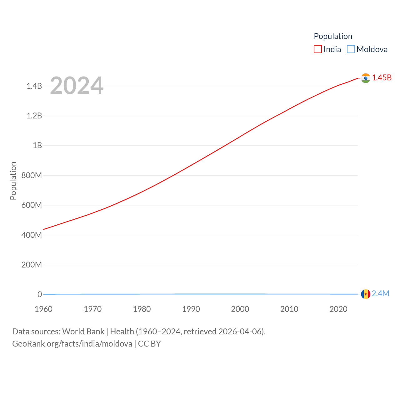 India has a population of 1.45B (ranked 1/197), compared with 2.4M in Moldova (ranked 143/197). India's land area is 1,147,955 sq mi versus 12,714 sq mi for Moldova (ranked 7th vs. 135th).