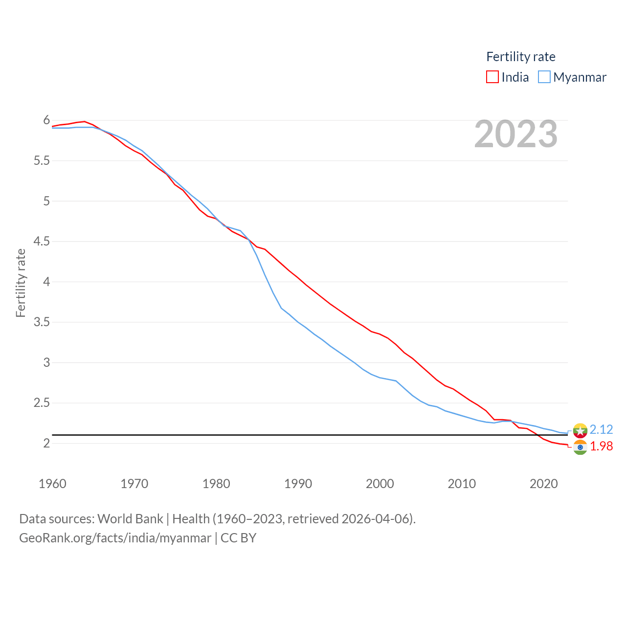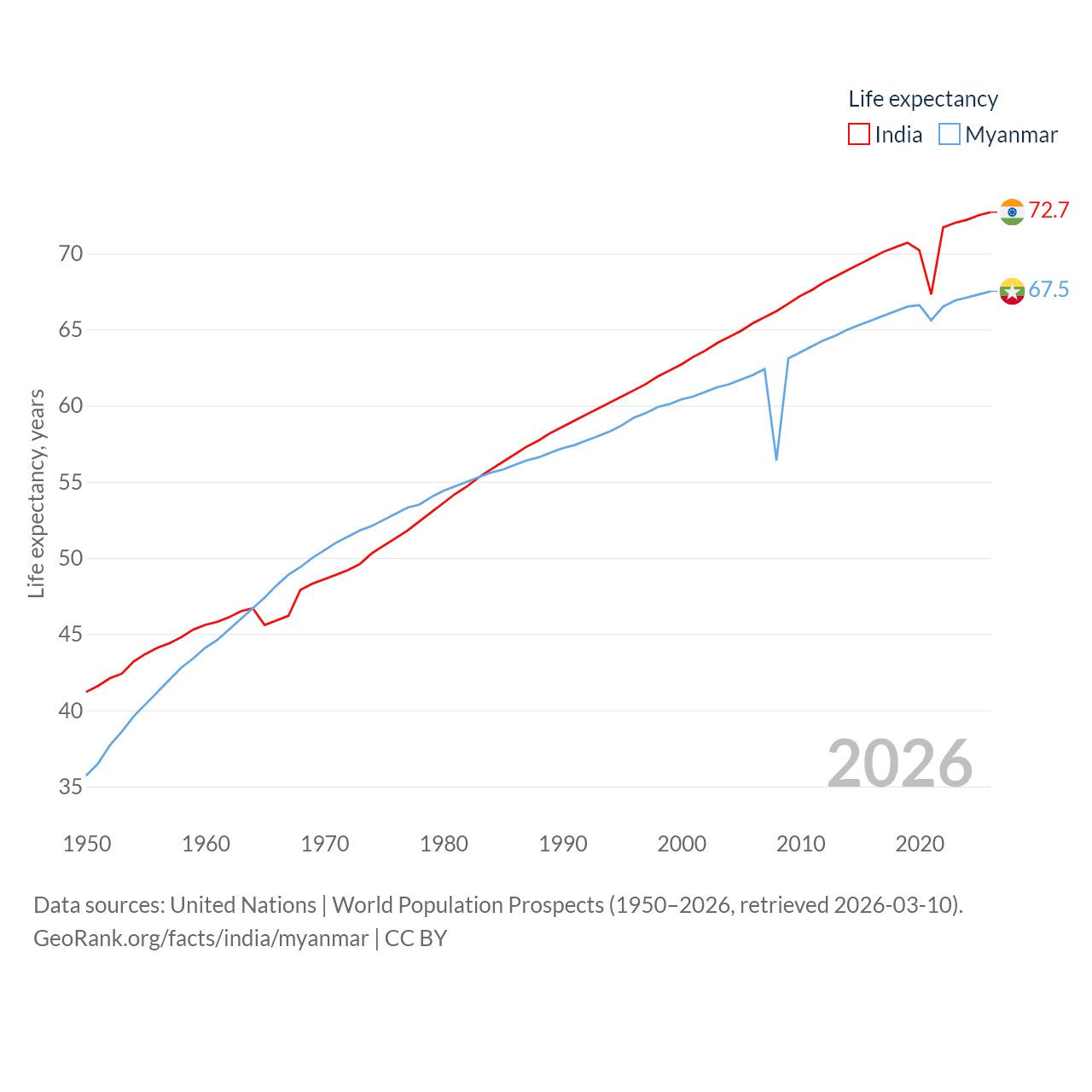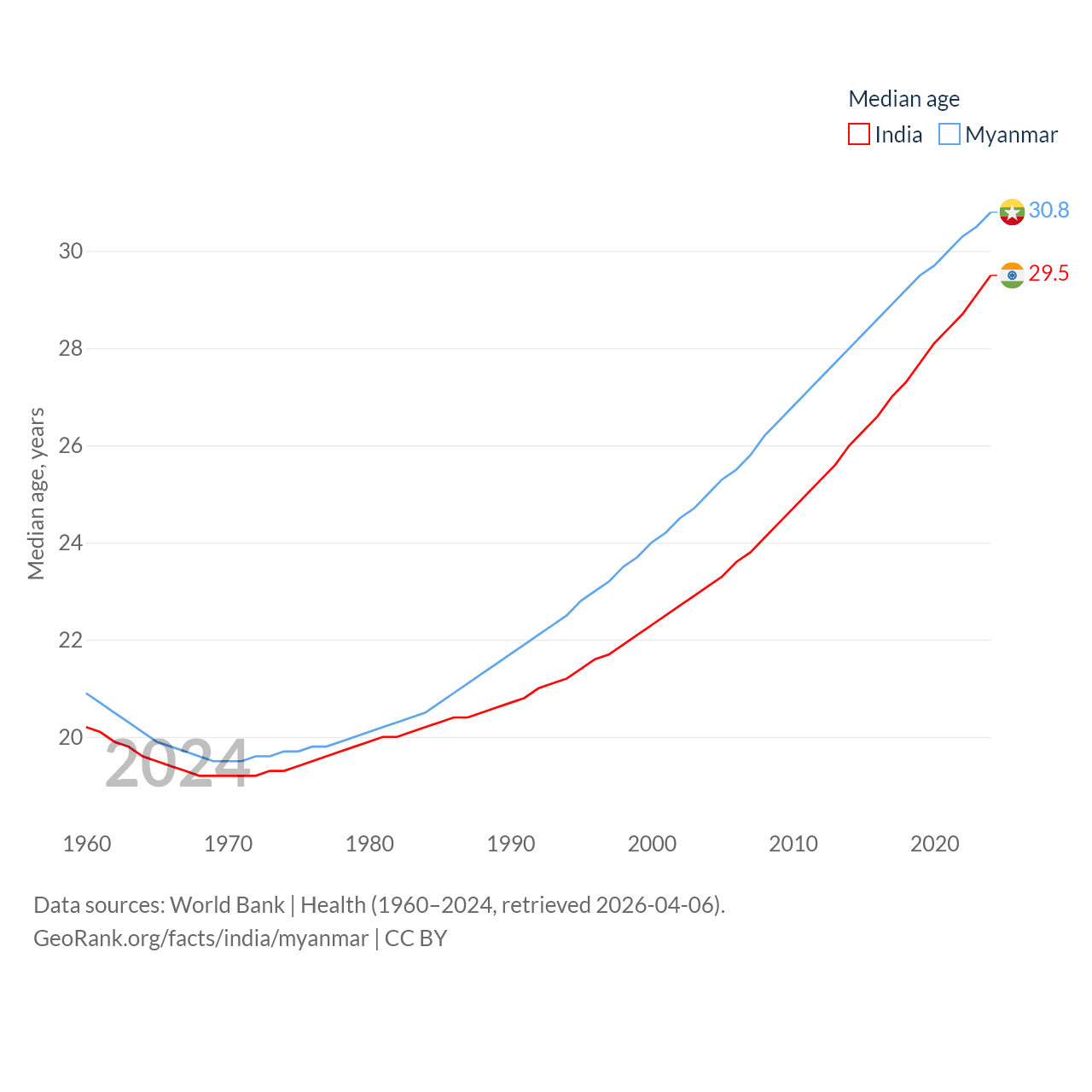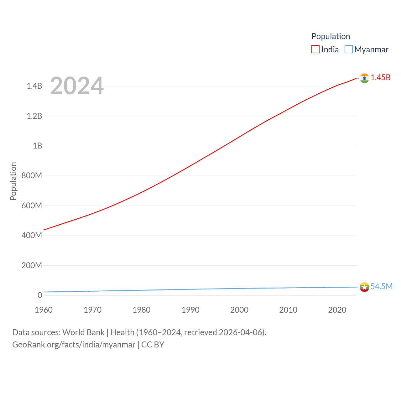 India has a population of 1.45B (ranked 1/197), compared with 54.5M in Myanmar (ranked 27/197). India's land area is 1,147,955 sq mi versus 251,997 sq mi for Myanmar (ranked 7th vs. 39th).