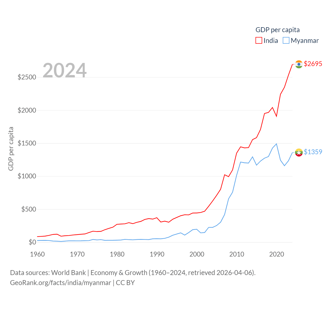 By GDP, India ranks 5/197 ($3.91T) and Myanmar ranks 85/197 ($74.1B). By GDP per capita, India ranks 143/197 ($2,695), while Myanmar ranks 165/197 ($1,359).