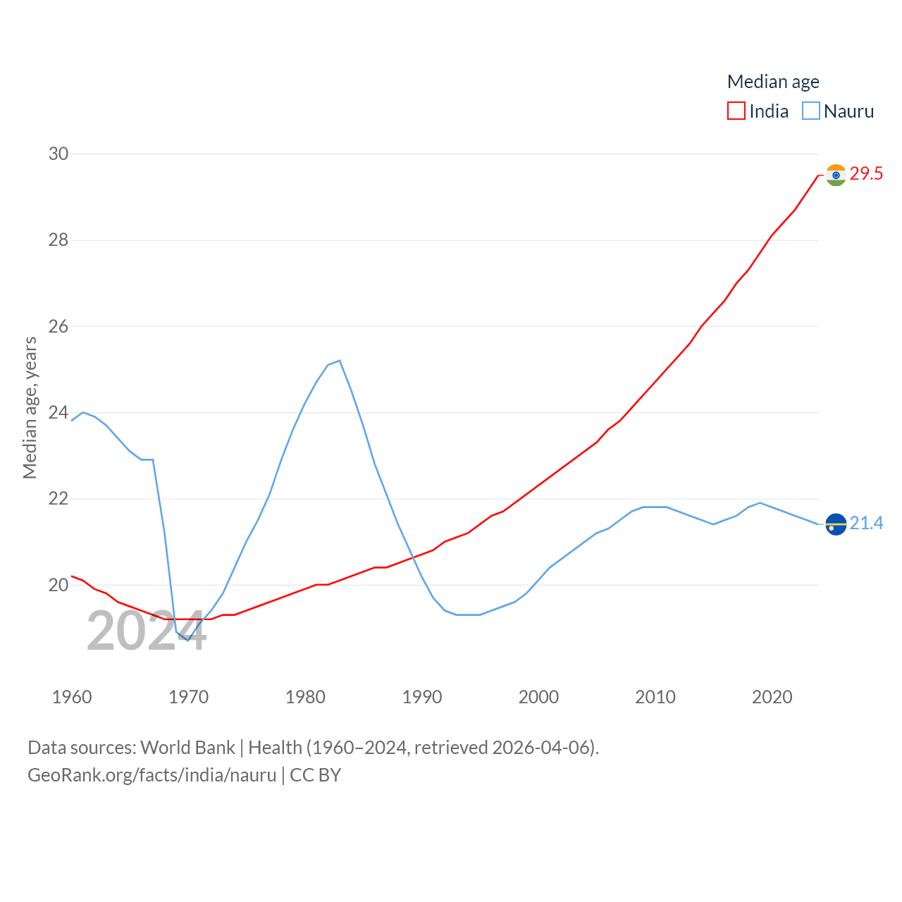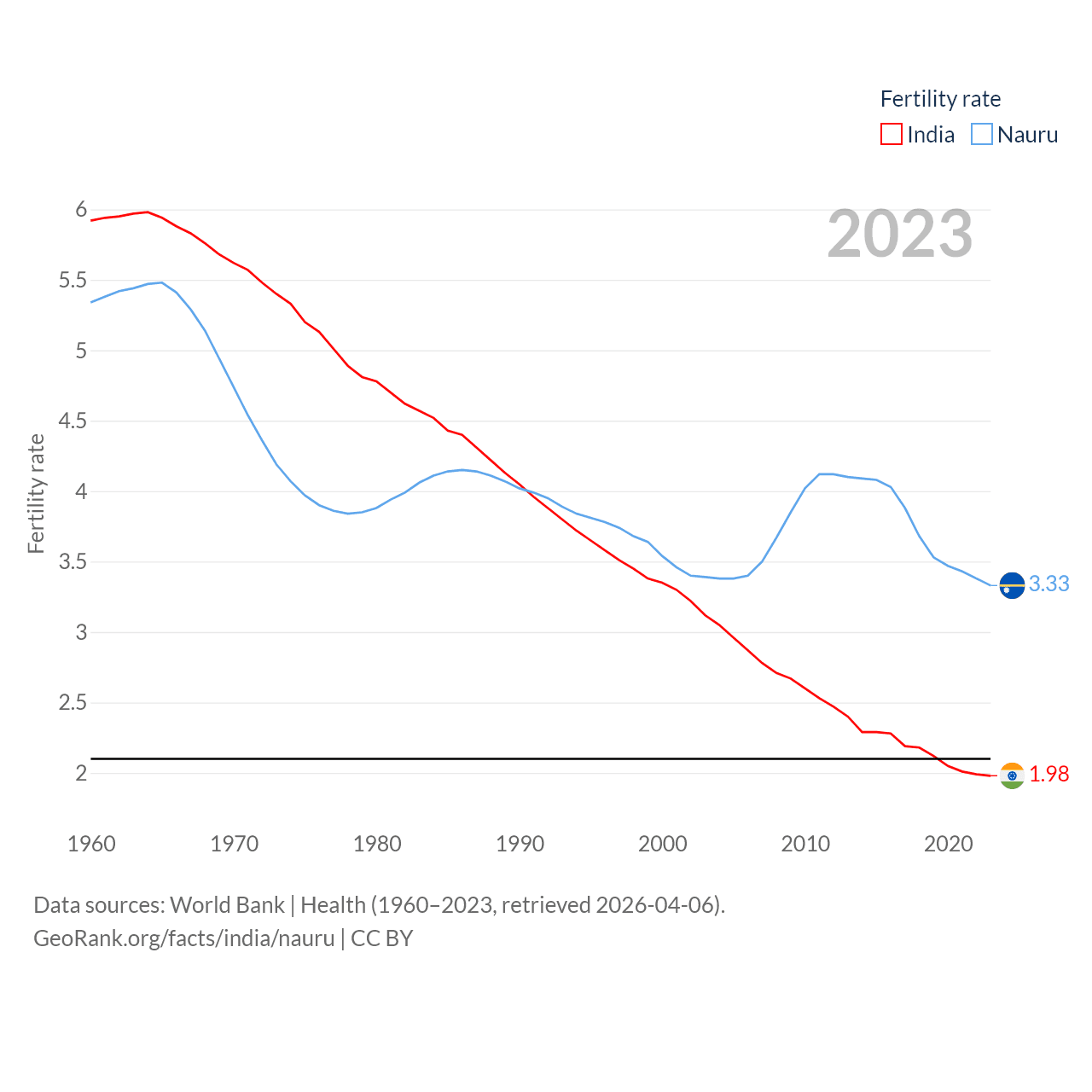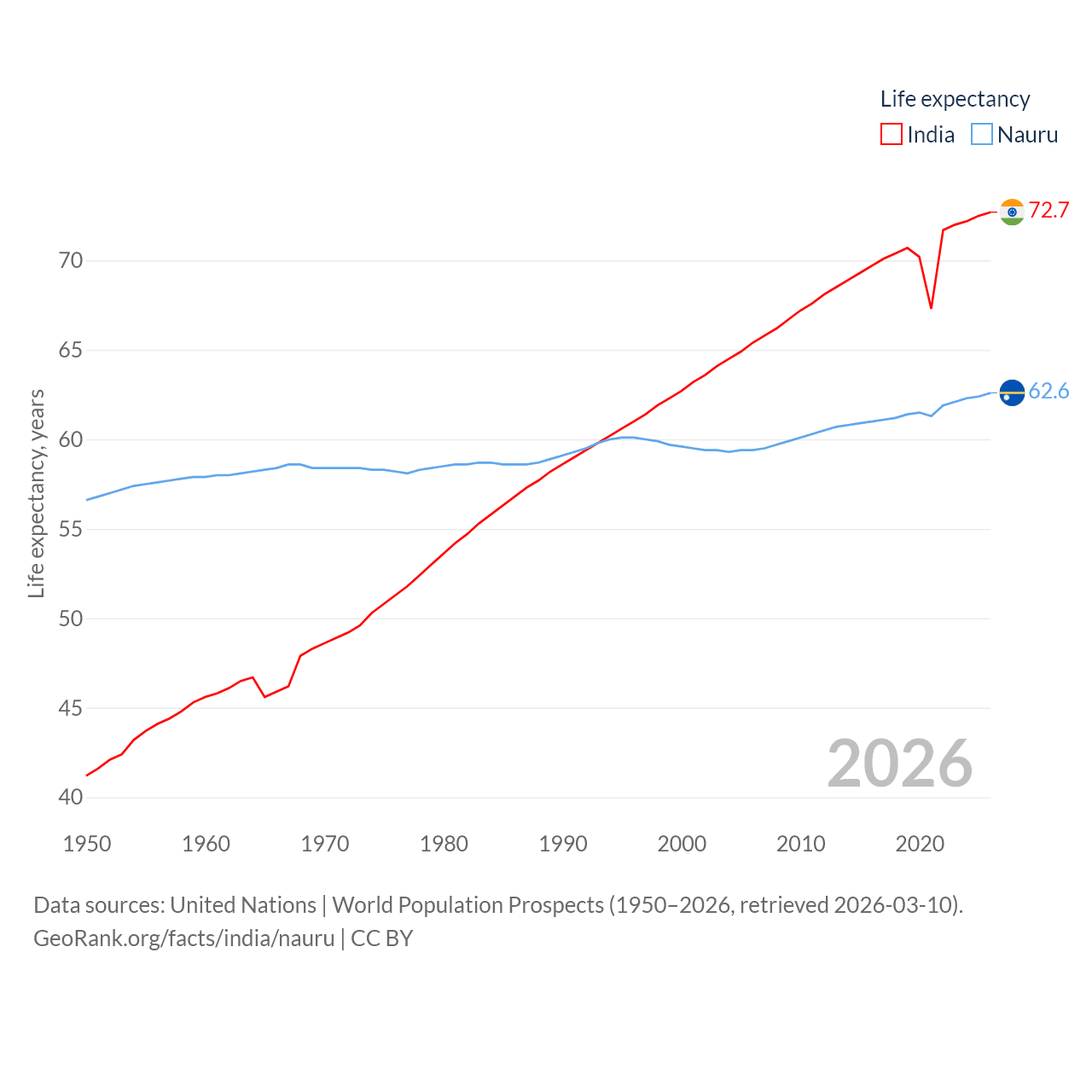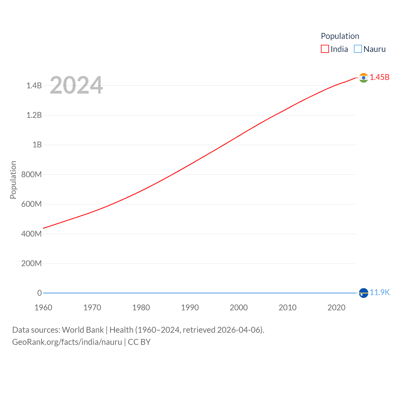 India has a population of 1.45B (ranked 1/197), compared with 11.9K in Nauru (ranked 195/197). India's land area is 1,147,955 sq mi versus 7.72 sq mi for Nauru (ranked 7th vs. 195th).