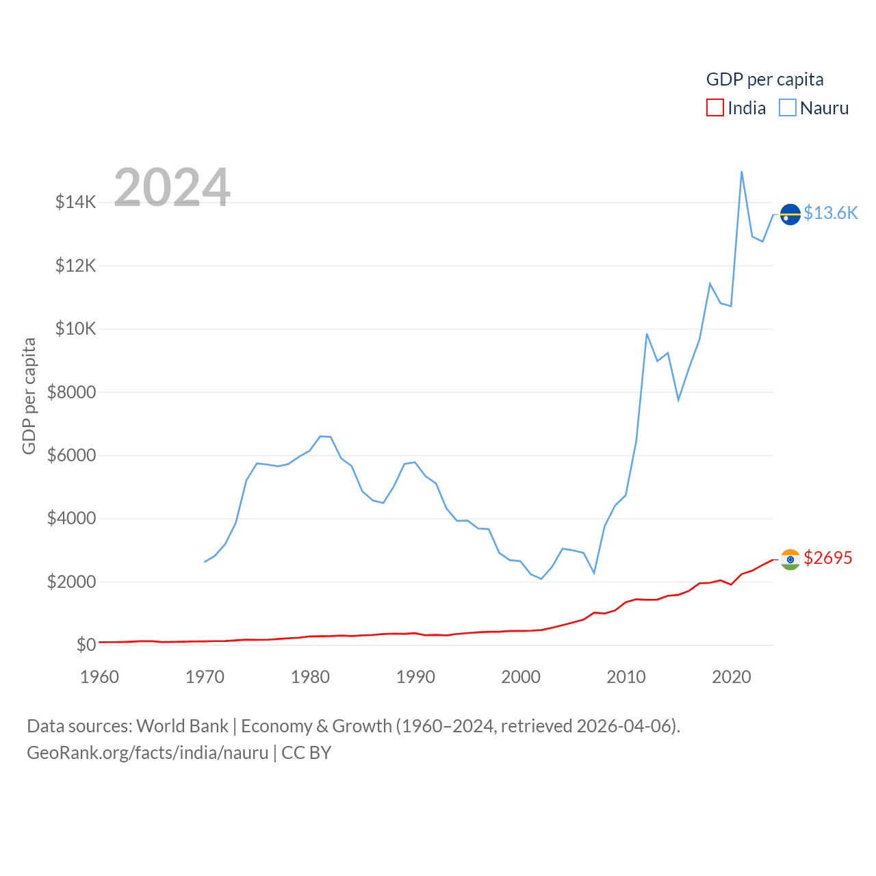 By GDP, India ranks 5/197 ($3.91T) and Nauru ranks 195/197 ($163M). By GDP per capita, India ranks 143/197 ($2,695), while Nauru ranks 74/197 ($13,609).