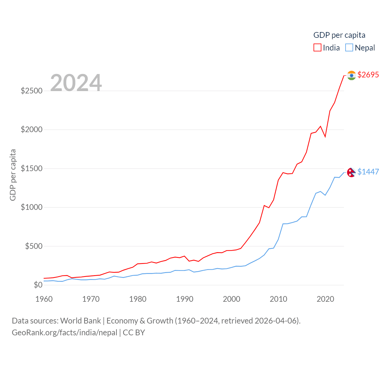 By GDP, India ranks 5/197 ($3.91T) and Nepal ranks 101/197 ($42.9B). By GDP per capita, India ranks 143/197 ($2,695), while Nepal ranks 164/197 ($1,447).