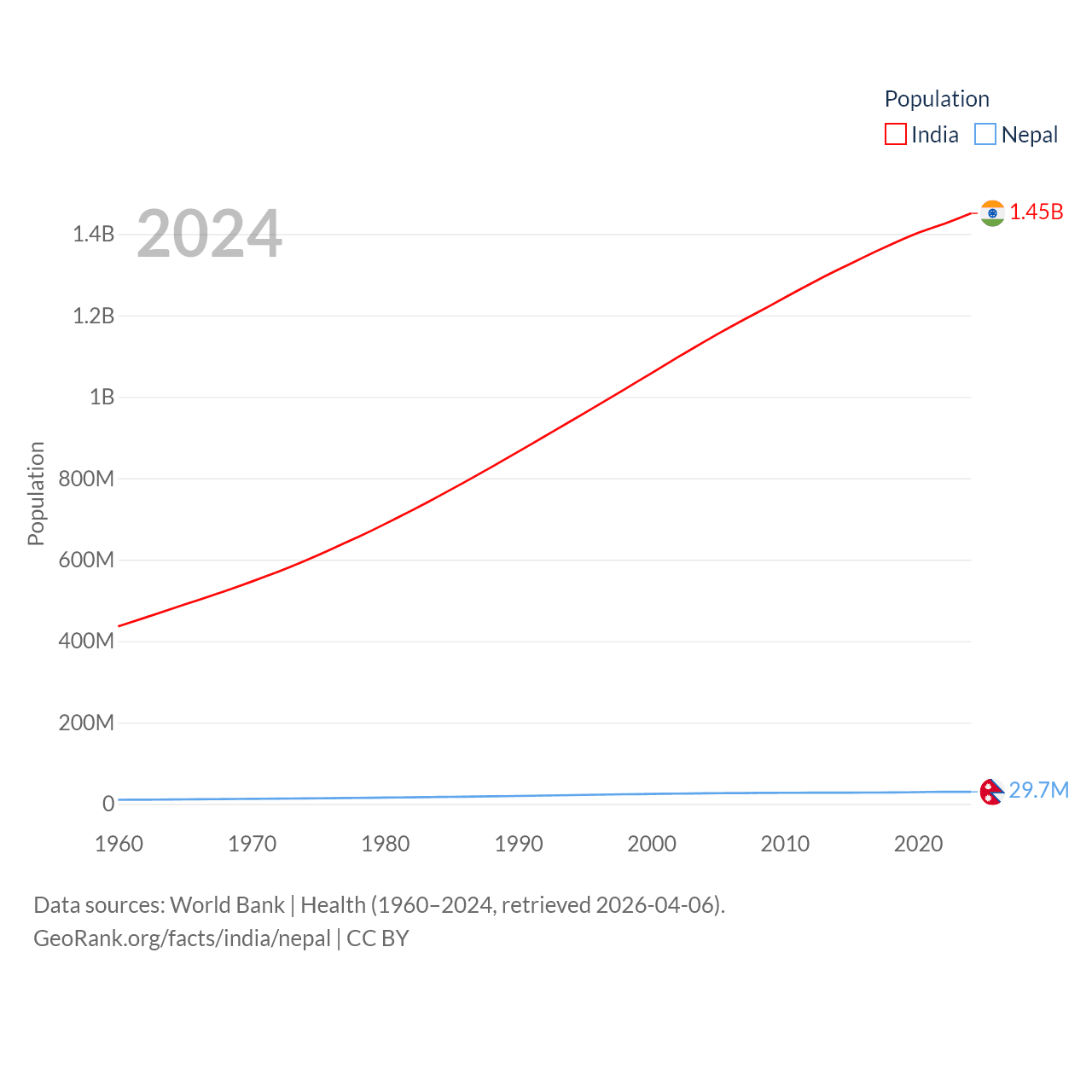 India has a population of 1.45B (ranked 1/197), compared with 29.7M in Nepal (ranked 51/197). India's land area is 1,147,955 sq mi versus 55,348 sq mi for Nepal (ranked 7th vs. 92nd).