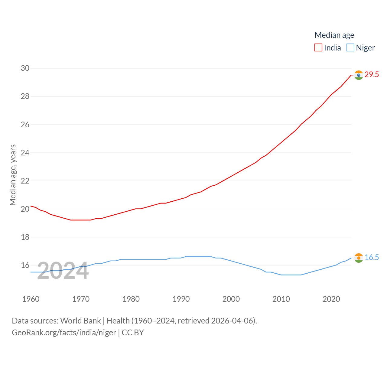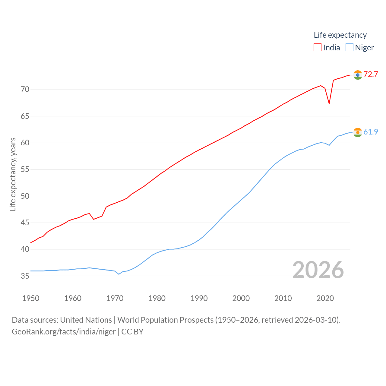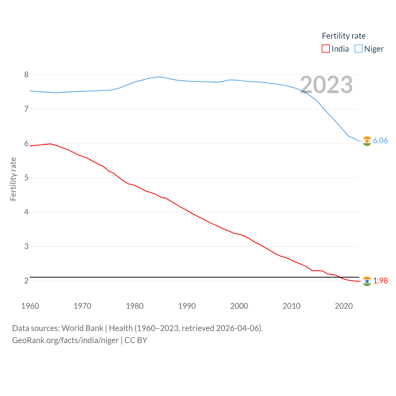 India has a population of 1.45B (ranked 1/197), compared with 27M in Niger (ranked 55/197). India's land area is 1,147,955 sq mi versus 489,076 sq mi for Niger (ranked 7th vs. 20th).