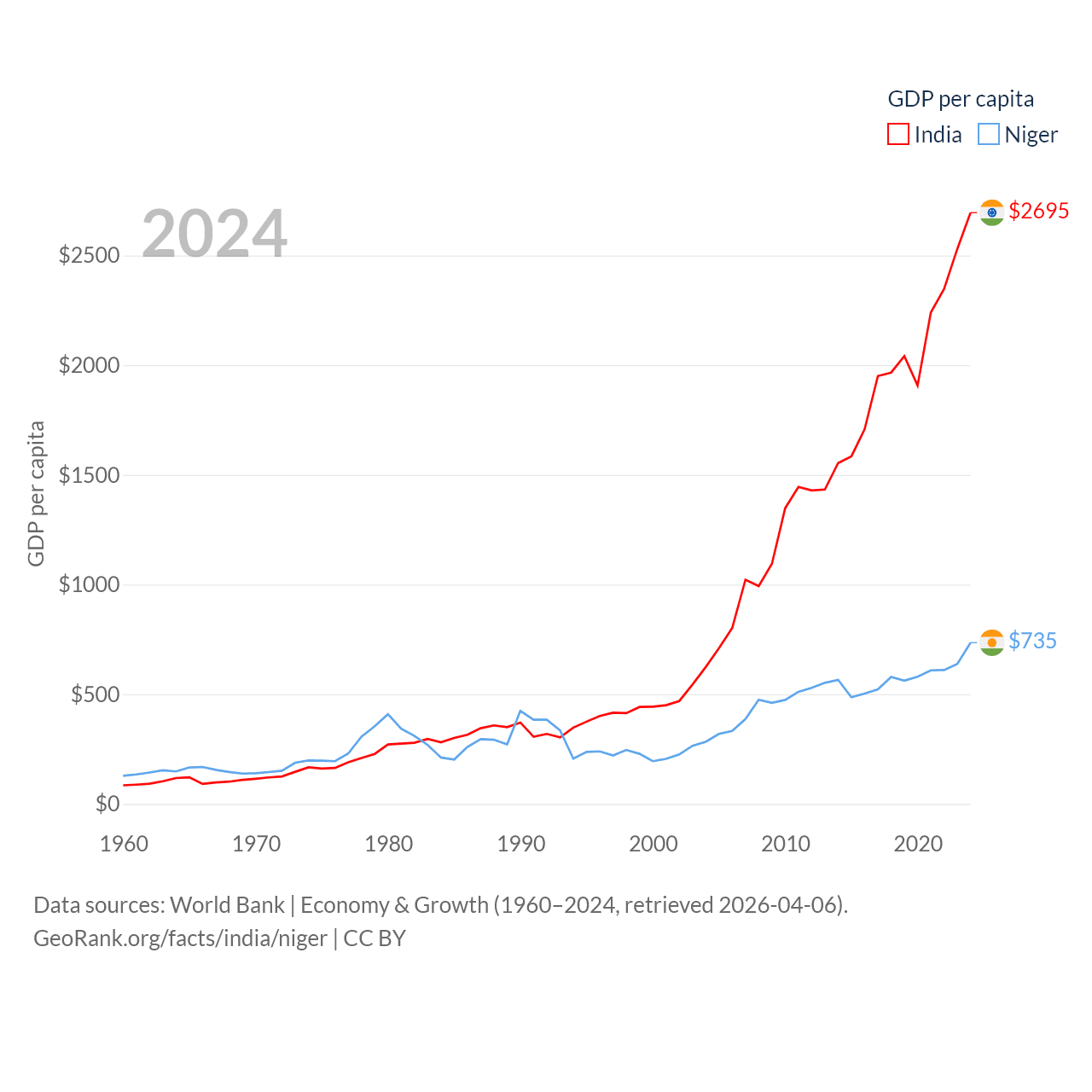 By GDP, India ranks 5/197 ($3.91T) and Niger ranks 130/197 ($19.9B). By GDP per capita, India ranks 143/197 ($2,695), while Niger ranks 187/197 ($735).