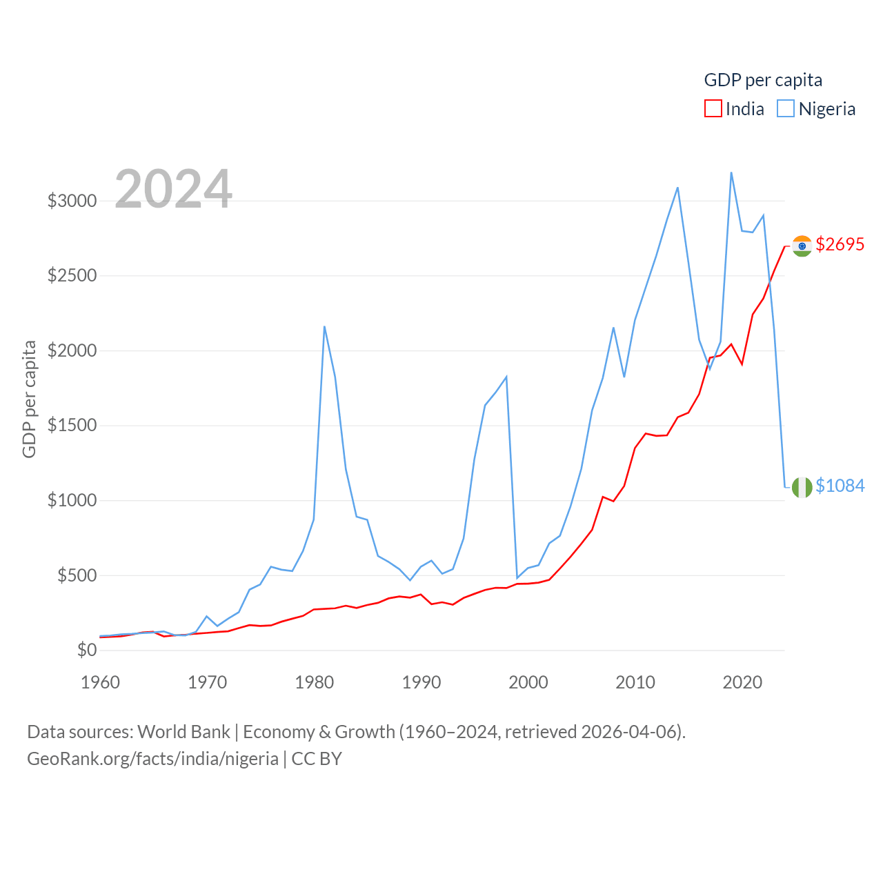 By GDP, India ranks 5/197 ($3.91T) and Nigeria ranks 54/197 ($252B). By GDP per capita, India ranks 143/197 ($2,695), while Nigeria ranks 174/197 ($1,084).