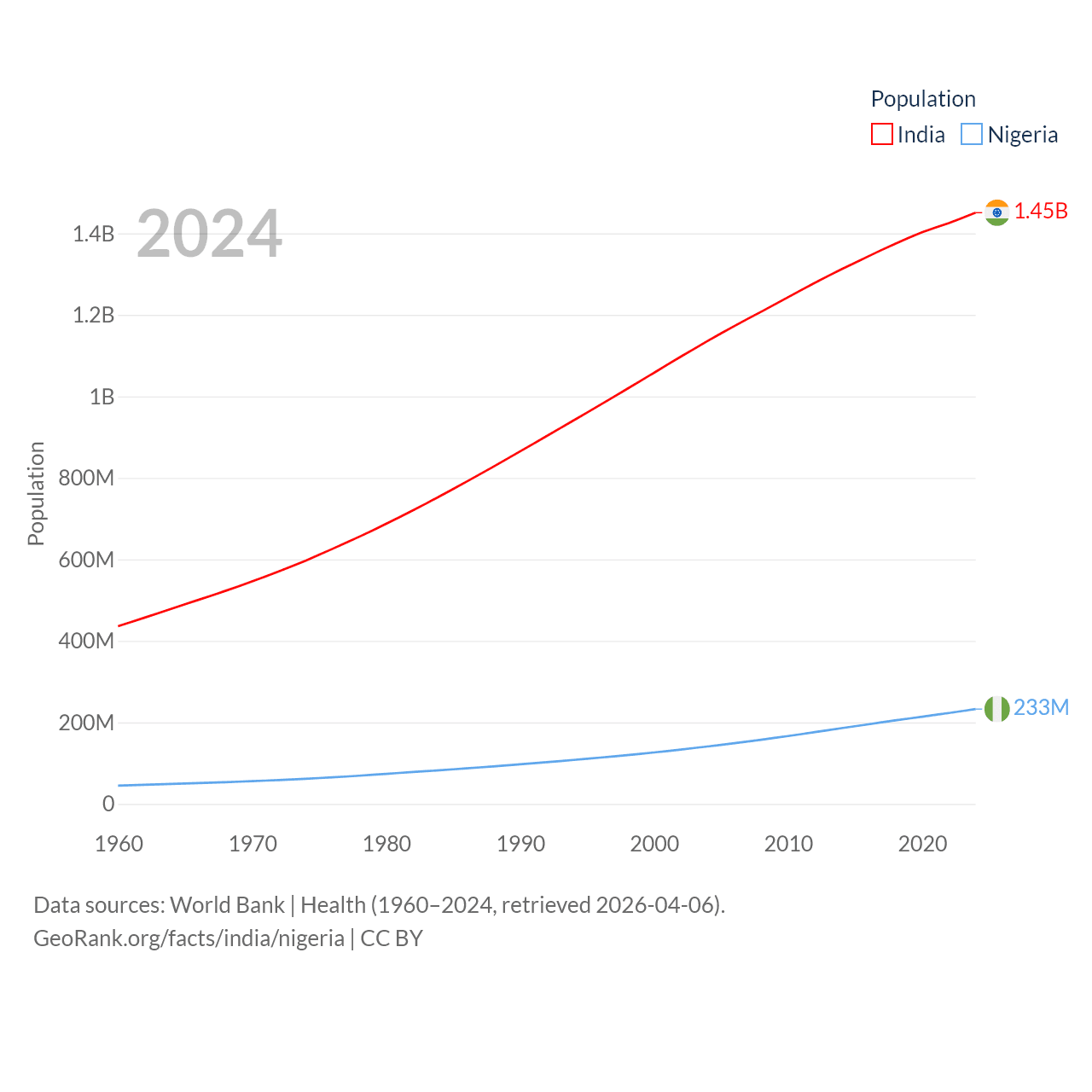 India has a population of 1.45B (ranked 1/197), compared with 233M in Nigeria (ranked 6/197). India's land area is 1,147,955 sq mi versus 351,650 sq mi for Nigeria (ranked 7th vs. 30th).