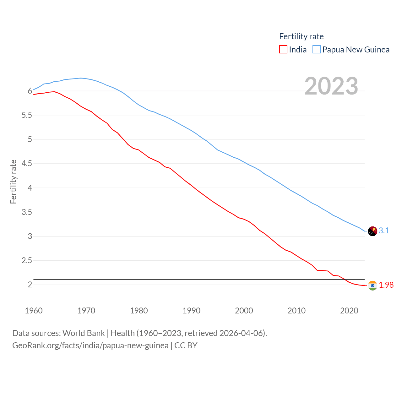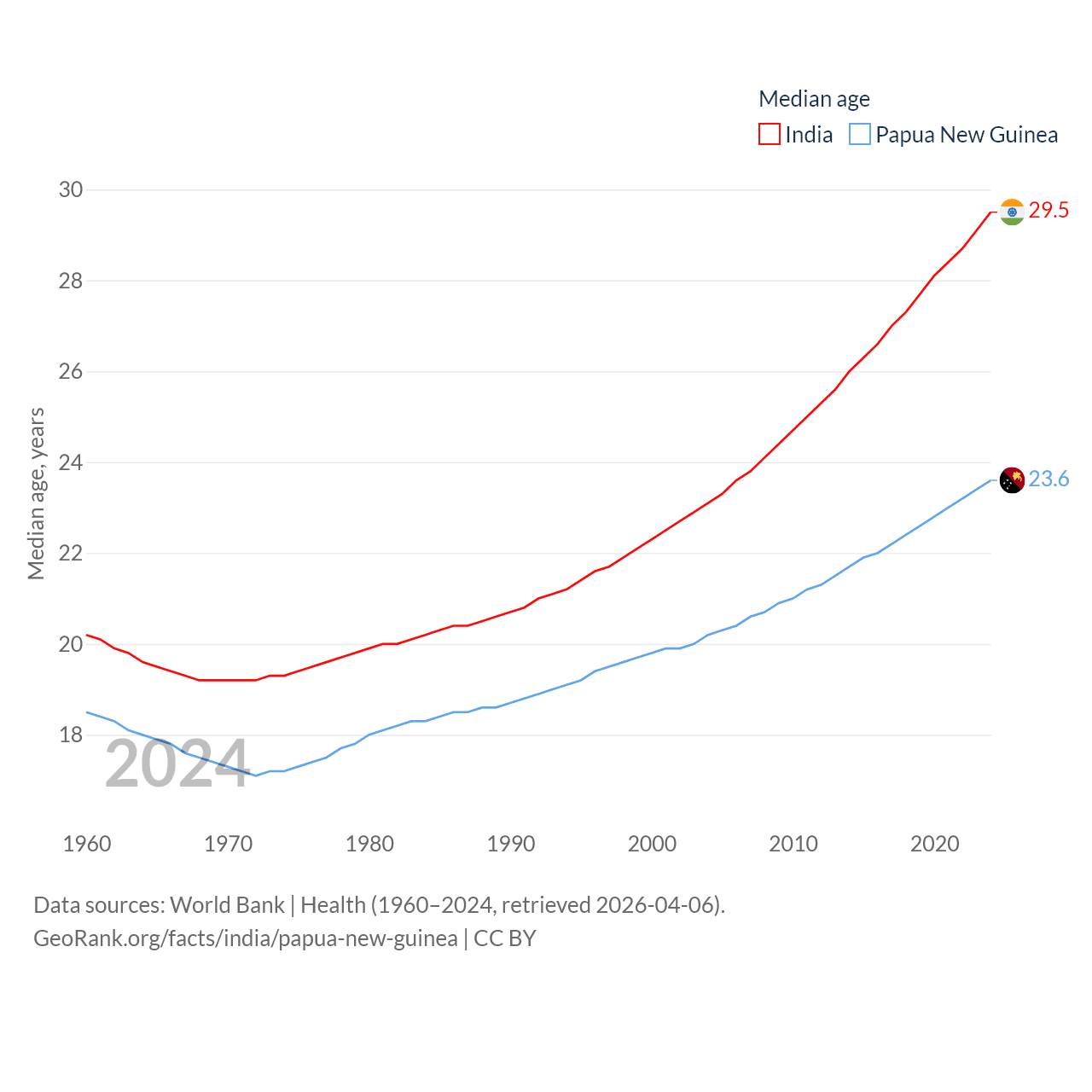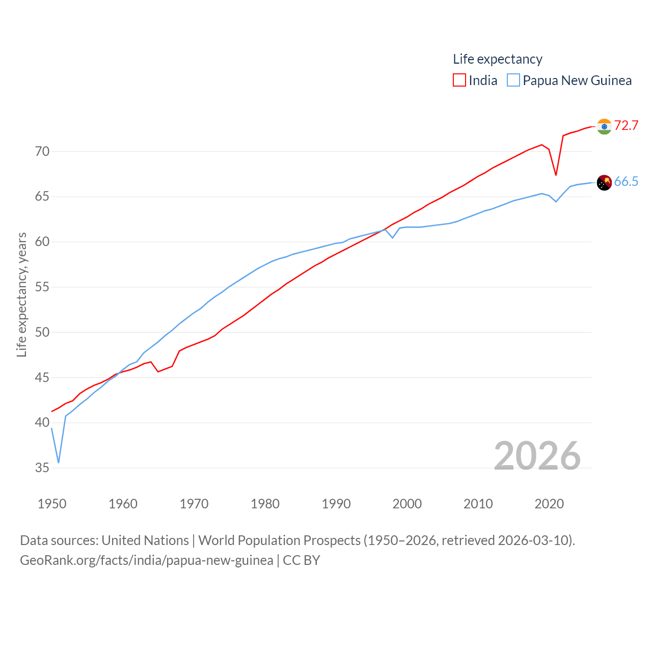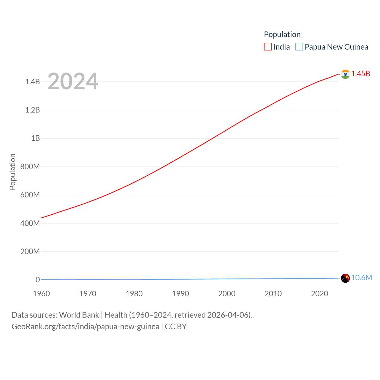 India has a population of 1.45B (ranked 1/197), compared with 10.6M in Papua New Guinea (ranked 92/197). India's land area is 1,147,955 sq mi versus 174,850 sq mi for Papua New Guinea (ranked 7th vs. 54th).