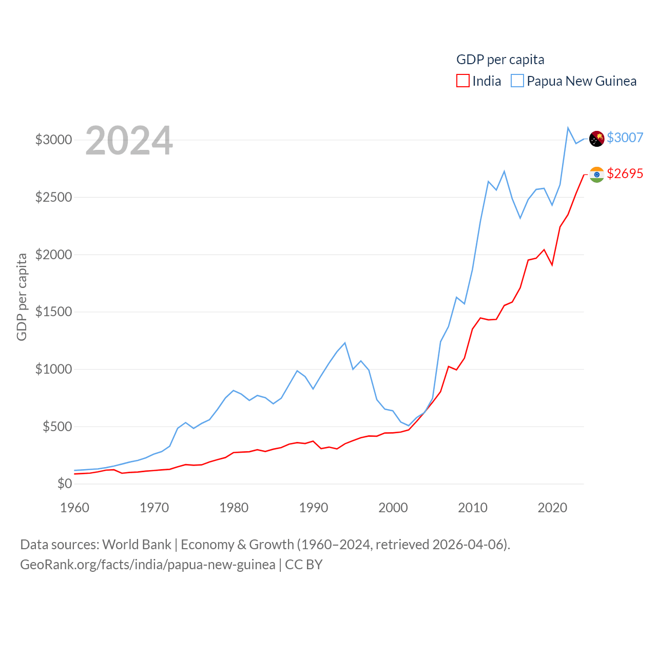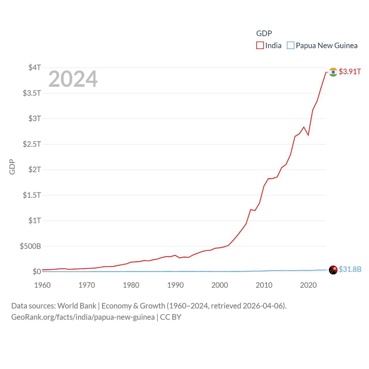 By GDP, India ranks 5/197 ($3.91T) and Papua New Guinea ranks 110/197 ($31.8B). By GDP per capita, India ranks 143/197 ($2,695), while Papua New Guinea ranks 140/197 ($3,007).
