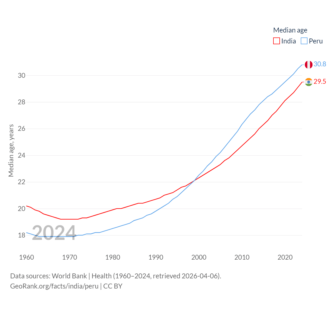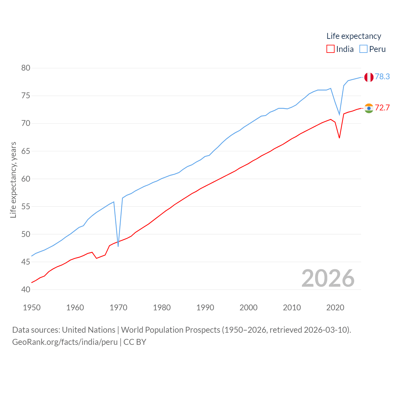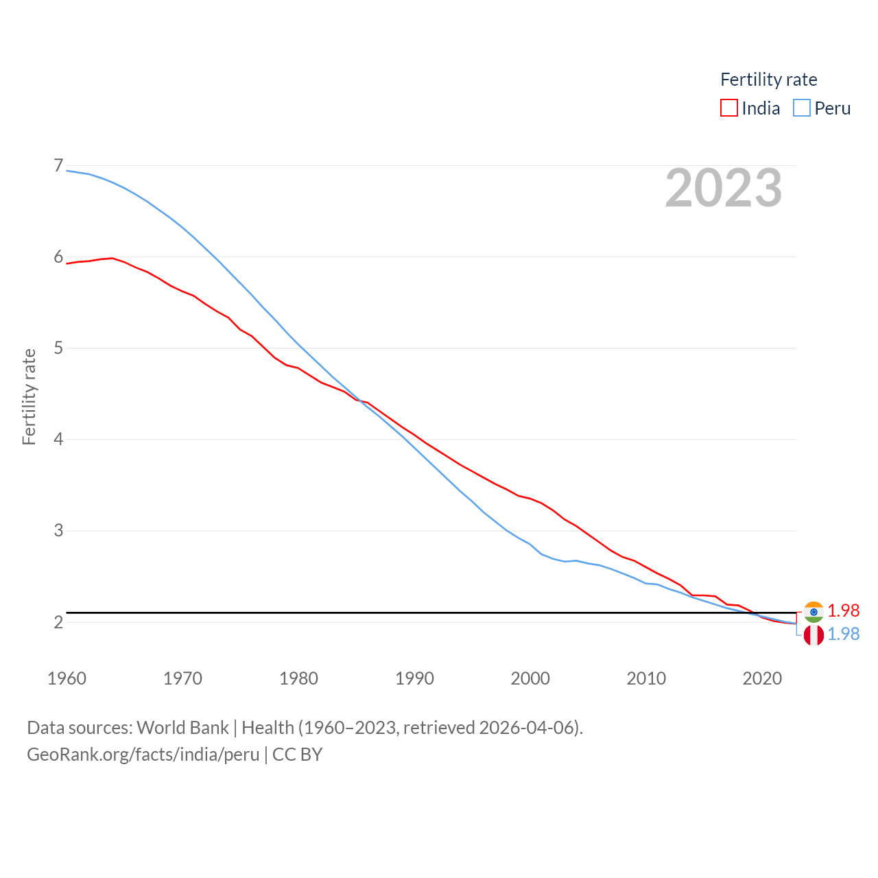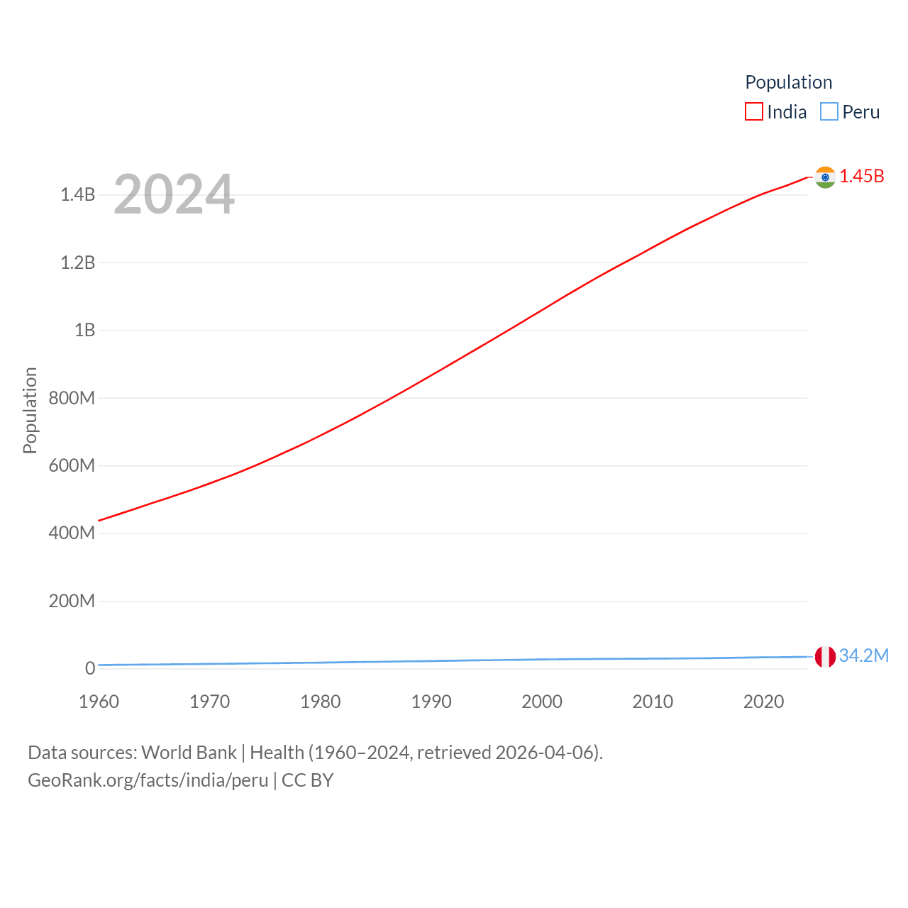 India has a population of 1.45B (ranked 1/197), compared with 34.2M in Peru (ranked 48/197). India's land area is 1,147,955 sq mi versus 494,211 sq mi for Peru (ranked 7th vs. 19th).