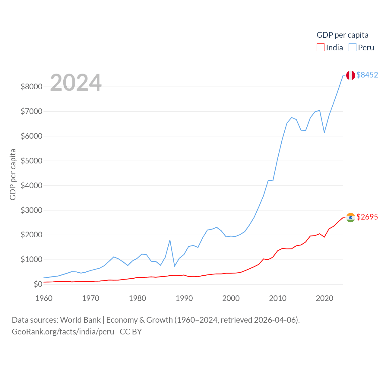 By GDP, India ranks 5/197 ($3.91T) and Peru ranks 49/197 ($289B). By GDP per capita, India ranks 143/197 ($2,695), while Peru ranks 91/197 ($8,452).