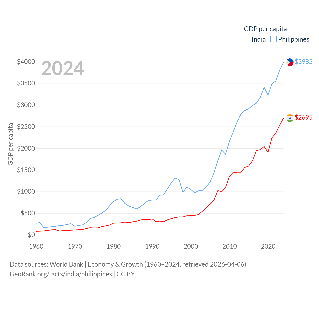 By GDP, India ranks 5/197 ($3.91T) and The Philippines ranks 35/197 ($462B). By GDP per capita, India ranks 143/197 ($2,695), while The Philippines ranks 130/197 ($3,985).